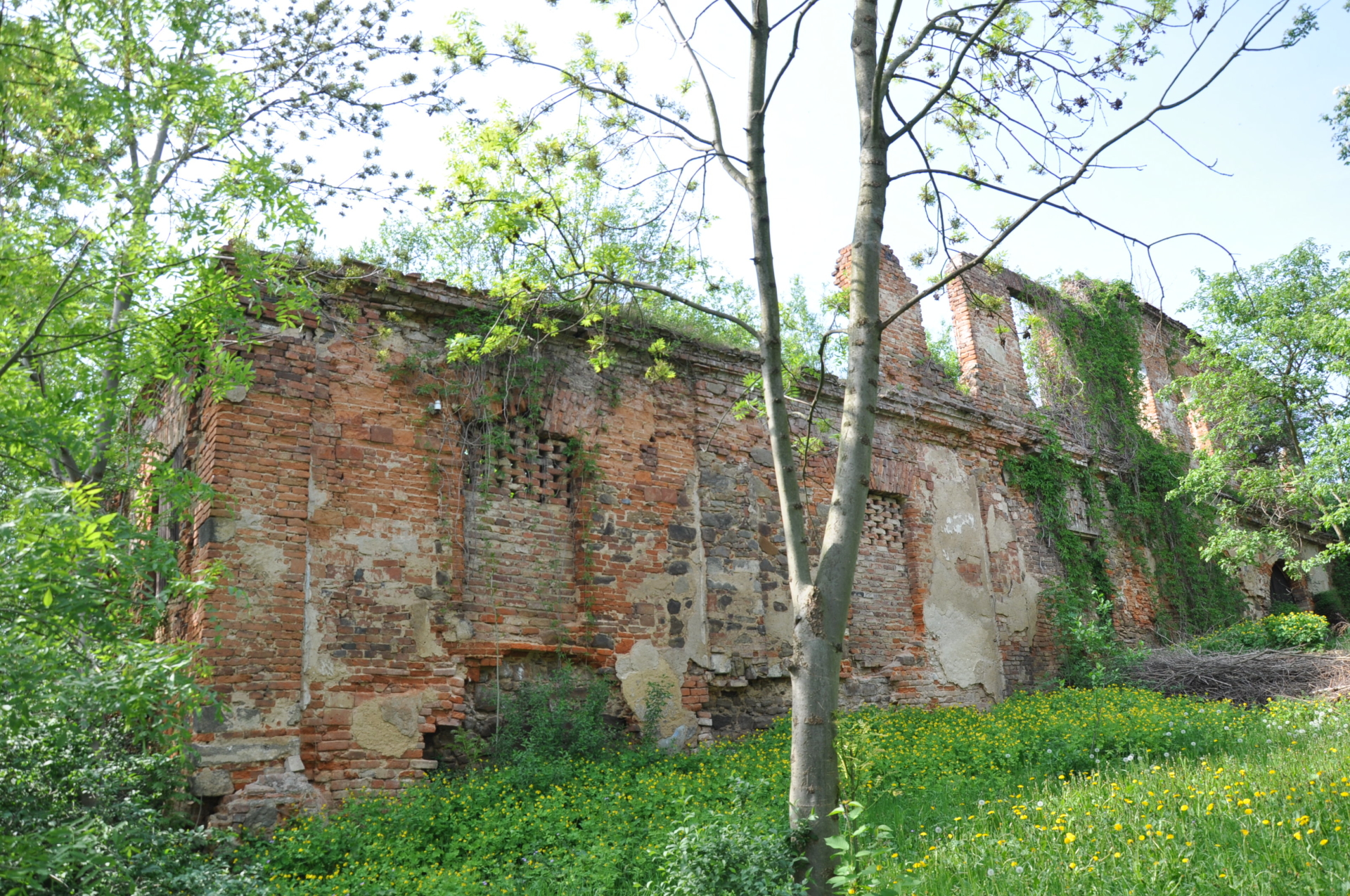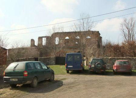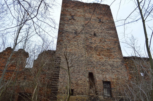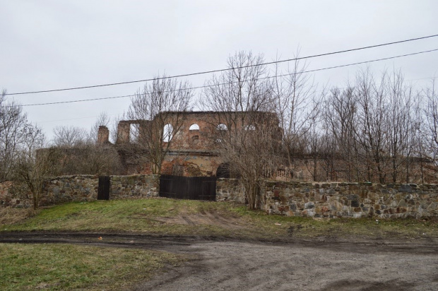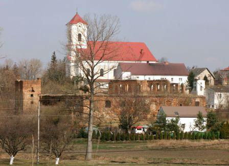 Ruiny zamku. W głębi - kościół parafialny