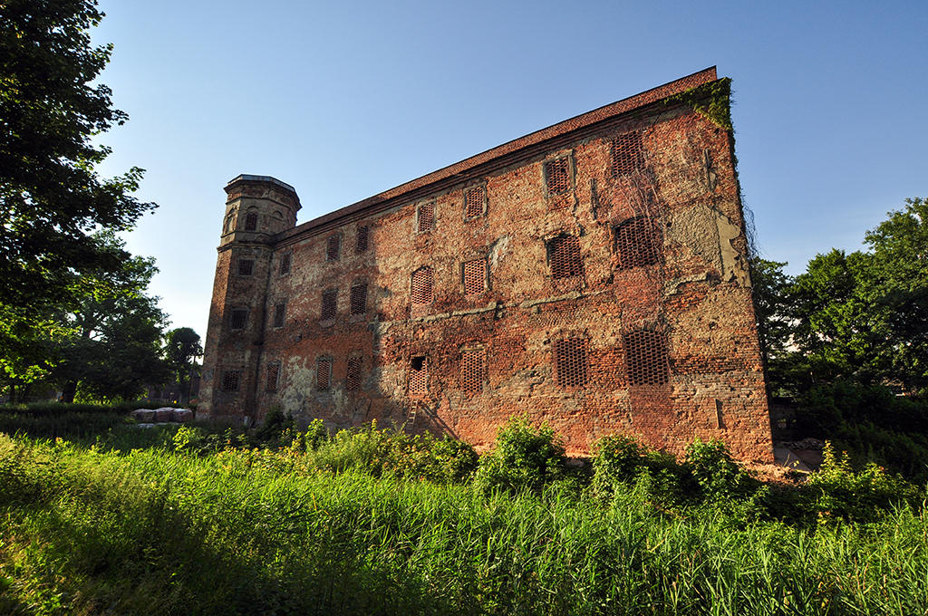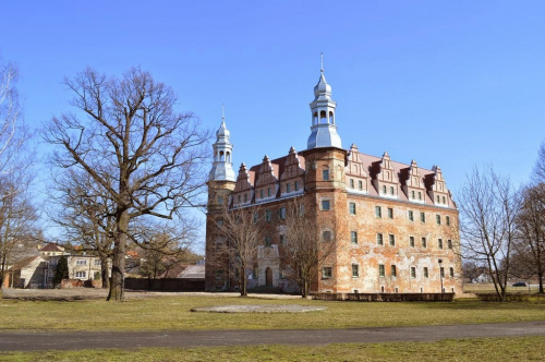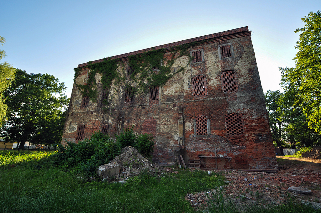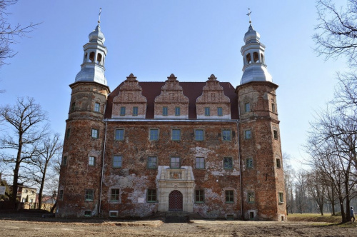 U stóp wzgórza, na którym stoi kościół, po przeciwległej (wschodniej) stronie głównej ulicy, zachowały się pozostałości dawnego zespołu pałacowego. Najstarszą część stanowią ruiny spalonego w 1945 r. późnorenesansowego pałacu, zbudowanego w 1617 r. przez Fryderyka Oppersdorfa i przebudowanego w 1894 r. przez Eberharda Matuszkę. Elewację frontową budowli flankują dwie ośmioboczne baszty, pomiędzy którymi znajduje się późnorenesansowy portal kamienny z osadzonymi w nim dwiema tablicami inskrypcyjnymi, odnoszącymi się do budowy i odnowienia pałacu. W zwieńczeniu portalu widnieje płaskorzeźbiony kartusz herbowy Matuschków.