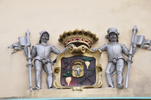 Nad wejściem do kaplicy św. Barbary (po południowej stronie kościoła) zachowała się kamienna tablica z inskrypcją fundacyjną z 1617 r., zwieńczona kartuszami herbowymi Oppersdorfów. Na zewnętrznej ścianie kaplicy św. Antoniego (po północnej stronie kościoła) zachował się kartusz herbowy Gaszynów z drugiej połowy XVIII w. (w nowszym obramieniu).