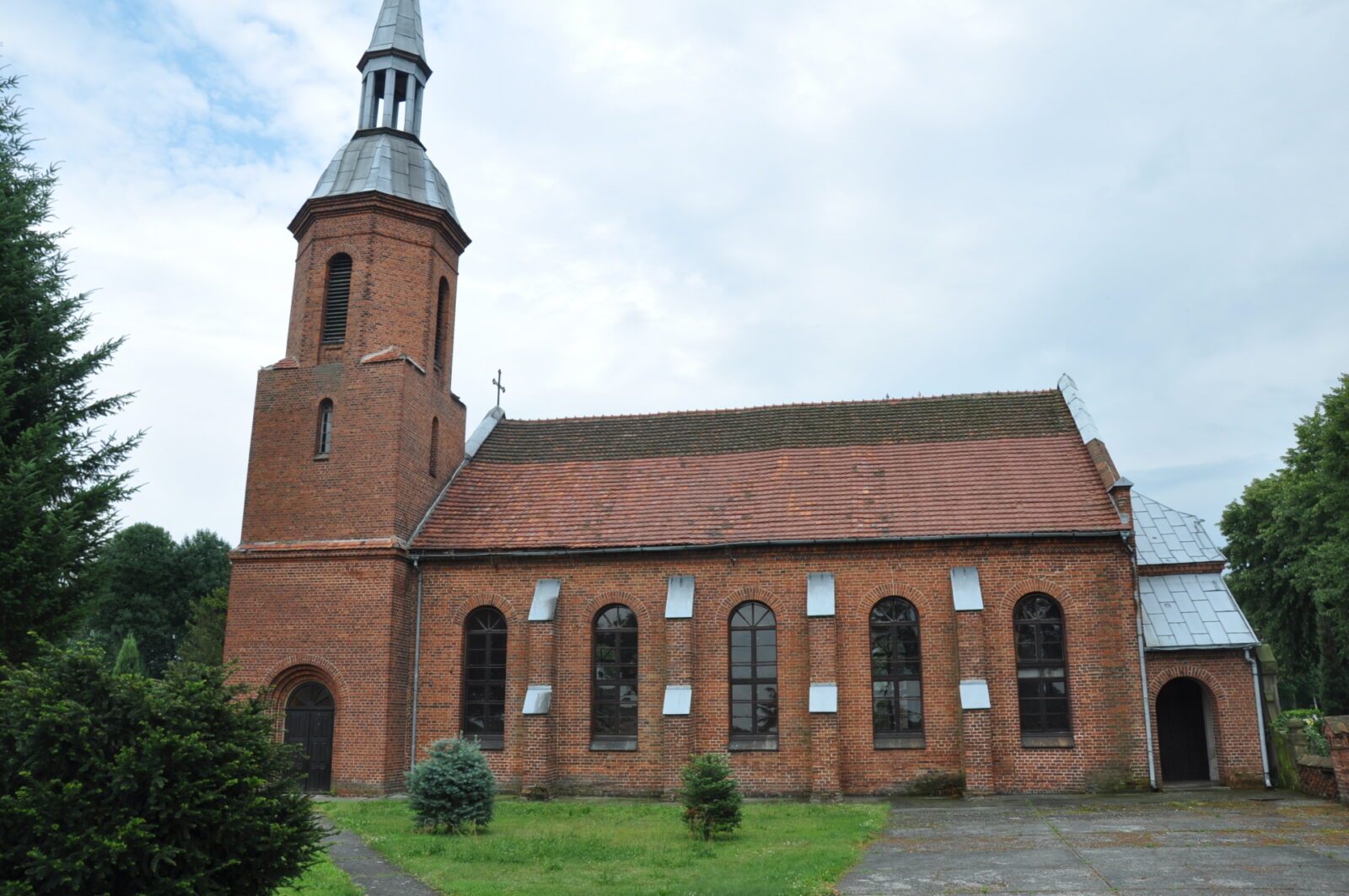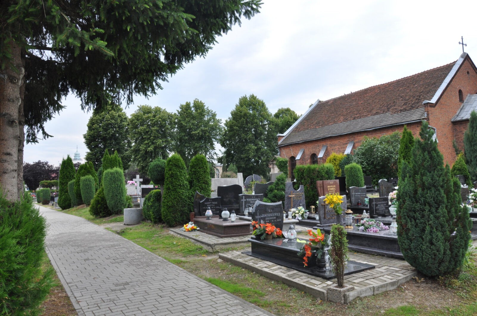 fragment cmentarza za kościołem, wyraźnie widać wyniosłość terenu