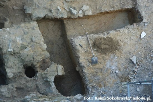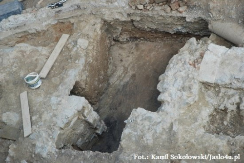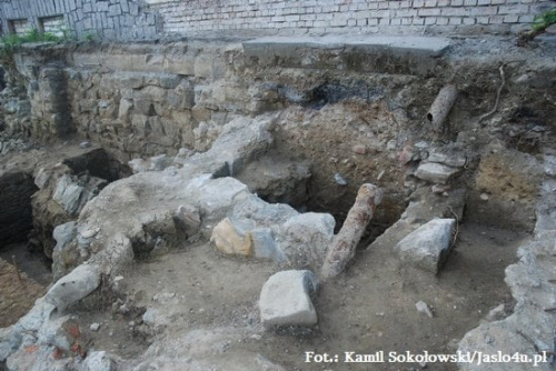 autor: Ewa Wawro, foto: Marek Dybaś Sensacyjne odkrycie archeologów. Znaleziono Koci Zamek sprzed 600 lat Ślady po Kocim Zamku odkryto w samym centrum Jasła, przy ul. Jagiełly. Prowadzono tam badania archeologiczne w celu udokumentowania pozostałości po synagodze sprzed stu lat. Okazało się jednak, że synagoga została zbudowana na fundamentach inne go budynku, przypuszczalnie z XV lub XVI wieku. - Znaleźliśmy pozostałości po dworze obronnym, który funkcjonował w tym miejscu -informuje Piotr Szmyd, archeolog z Muzeum Podkarpackiego w Krośnie. – Są tutaj widoczne pozostałości po dworze obronnym, w tym po murach, oraz mur będący pozostałością po synagodze. Gmina żydowska, która kupiła ten teren, wykorzystała prawdopodobnie zarówno budulec jak i ścianę działową muru obronnego budując mur fundamentowy. Informacje o Kocim Zamku można znaleźć w „Opisie powiatu jasielskiego” ks. Sarny. XIX-wieczne plany i szkice pokazują kształt i wymiary budowli. Dwór miał podstawę kwadratu o boku długości około 18,5 metra. W narożach korpusu budynku były kwadratowe alkierze, również kwadratowe, o boku długości 5 m. Zamek miał zwartą, prostą bryłę i wtapiał się w brzeg skarpy. Uwagę zwraca obszerna sień, która mogła pełnić funkcje publiczne i administracyjne, co pozwala przypuszczać, że zamek był miejscem urzędowania starostów jasielskich. Mógł też służyć za skarbiec i archiwum, gdyż był jedynym murowanym gmachem w średniowiecznym Jaśle. W miejscu, w którym odkryto mury Kociego Zamku, ma powstać galeria handlowa. Obecnie trwają rozmowy dotyczące eksponowania części dworu i synagogi. Odkrycie ma zostać włączone przez inwestora w koncepcję zagospodarowania terenu. Nie ma jednak jeszcze ostatecznych uzgodnień. Fot. terazJaslo.pl / Damian Palar