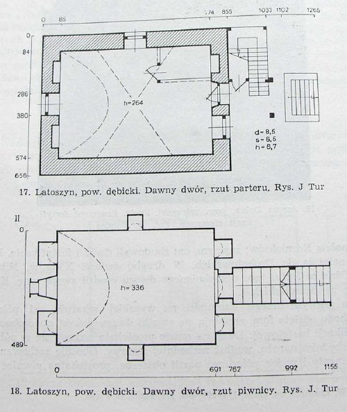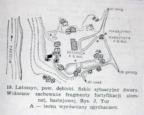 Dwór obronny w Latoszynie powstał w XVII wieku. Był to niewielki obiekt, później zaczął pełnić funkcję lamusa gdyż właściciele przenieśli się do wybudowanego w pobliżu pałacu. Obecnie stoi mocno zdewastowany w przypałacowym parku.