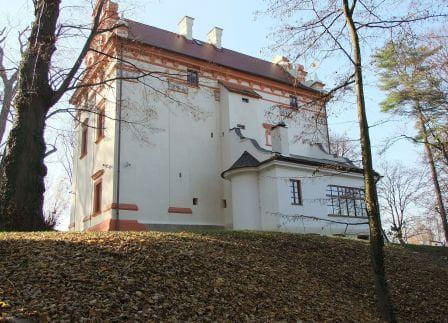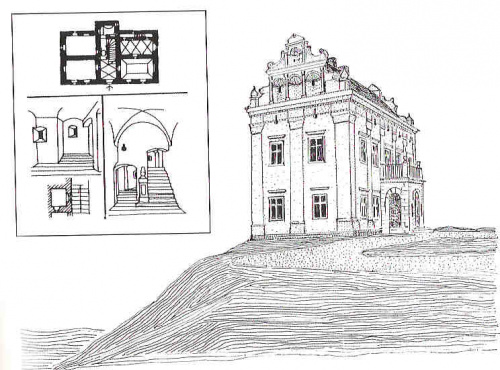 Rzut dworu i szkic obronnej sieni wg. J.Bogdanowskiego(źr:Zamki w dziejach Polski i Słowacji,t.II,str.27)