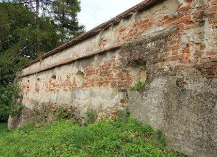 W otaczającym murze i na dzwonnicy umieszczono otwory strzelnicze, przy murze północno - zachodnim znajdowała się też wieża obronna, której fundamenty odkryto w roku 1963. Na linii wschód - zachód istniała nadto fosa. (fot. sierpień 2011)