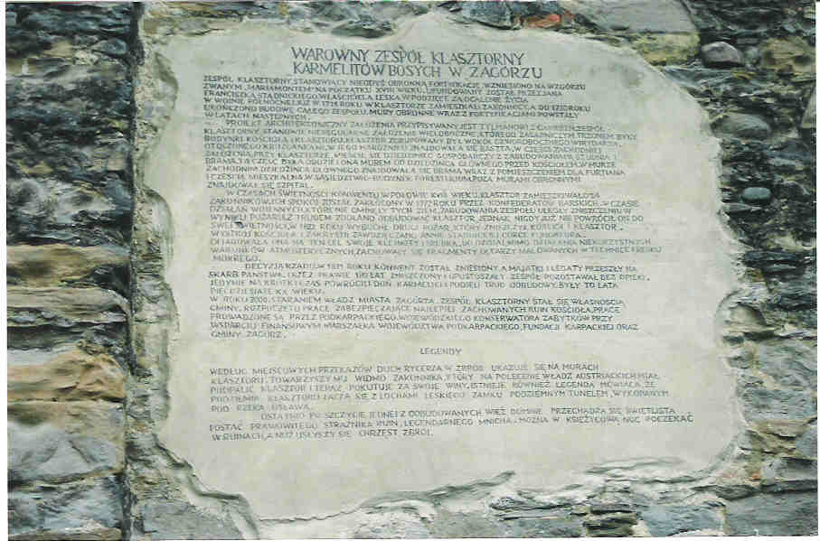 W roku 1710 w Zagórzu nad Osławą hr. Jan Adam Stadnicki wojewoda wołyński, zbudował obronny klasztor-twierdzę oo. Karmelitów. W obrębie murów znajdował się kościół, klasztor, dwie baszty, piętrowa kordegarda, budynki gospodarcze. Od 1713 również jako klasztor szpital dla inwalidów wojennych. W 29 listopada 1772 roku w klasztorze miał miejsce pierwszy pożar. Ukryli się tu i bronili konfederaci barscy przed ostrzeliwaniem, a wojska rosyjskie oblegały klasztor. "Teresa z hrabiów na Żmigrodzie Stadnickich, herbu Śreniawa, Ossolinska, Wojewodzina, Wołynska w Rymanowie, zmarła dn. 6 maja 1776 r. w Zagórzu u OO. Karmelitów pochowana" (wg tablicy w kościele w Lesku). Klasztor został zamknięty dekretem zaborczym, cesarza Józefa II, w roku 1789. Pod koniec roku 1830, w czasie powstania listopadowego pożar zniszczył klasztor w stanie ruiny pozostaje do dziś.