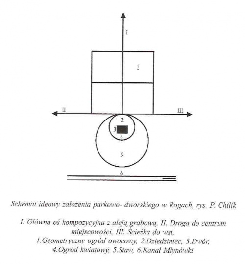 Nowożytny dwór powstał na miejscu zamku po najazdach kozacko-węgierskich oraz po potopie szwedzkim. Budynek rogowskiego dworu stanął na wyspie wśród stawów. Na jej teren prowadził pierwotnie most zwodzony, w późniejszym okresie stały most z kamienia. Był to specyficzny przypadek załozenia przestrzennego w typie palazzo in fortezza" gdzie budynek pałacowy znajduje się wewnątrz obwarowań. W Rogach funkcje obronne pełniły głebokie fosy wypełnione wodą.