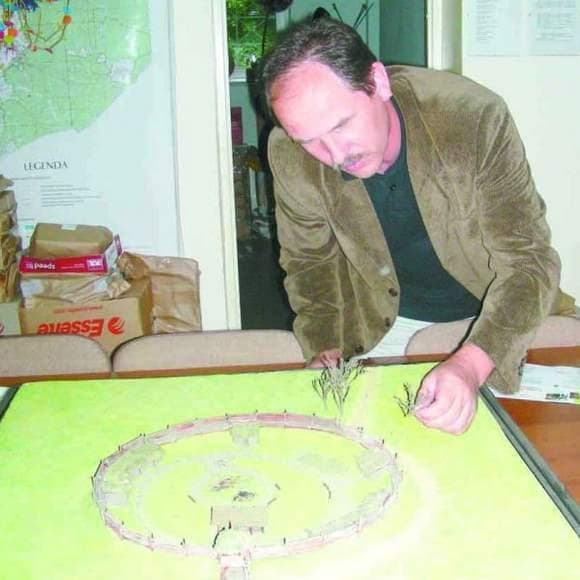 Mirosław Stepaniuk przy makiecie rekonstrukcji Grodziska w Zbuczu