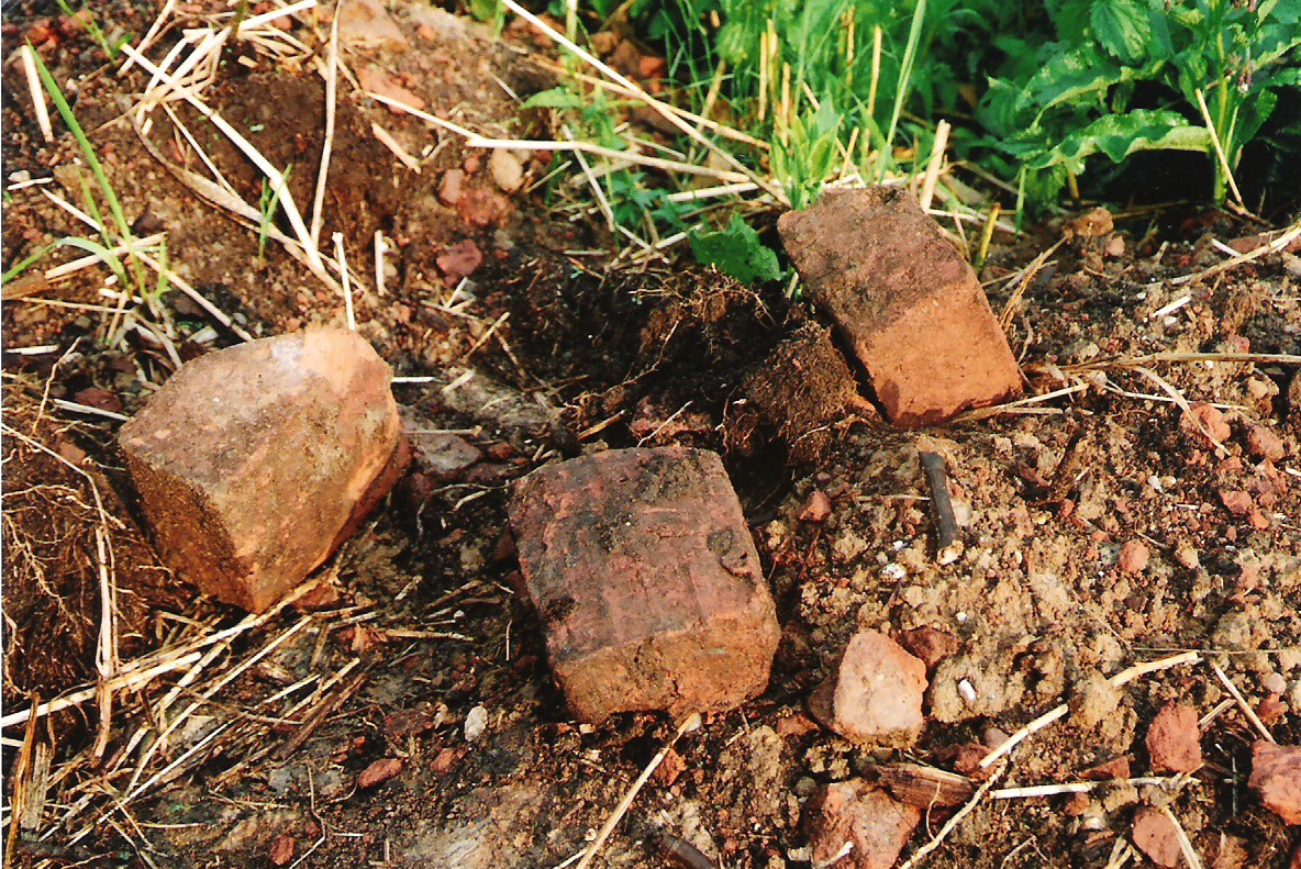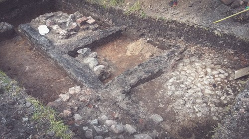 Podczas prac archeologicznych natrafiono w najwyższym punkcie badanego terenu na konstrukcję składająca się z gruzu ceglanego i ułożonych na nim w dwóch warstwach płytek ceramicznych o rozmiarach 19x19 cm. Jest to przypuszczalnie fragment chodnika prowadzącego do budynku mieszkalnego. Obok, od strony wschodniej podmokły teren został wybrukowany różnej wielkości kamieniami polnymi. Natrafiono na pozostałości drewnianych belek które stanowiły umocnienie brzegów ułożonego bruku. Rozmieszczone były one w odległości około 5 m od siebie co pozwala sądzić, że tworzyły pola wypełnione kamieniami.