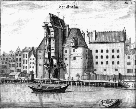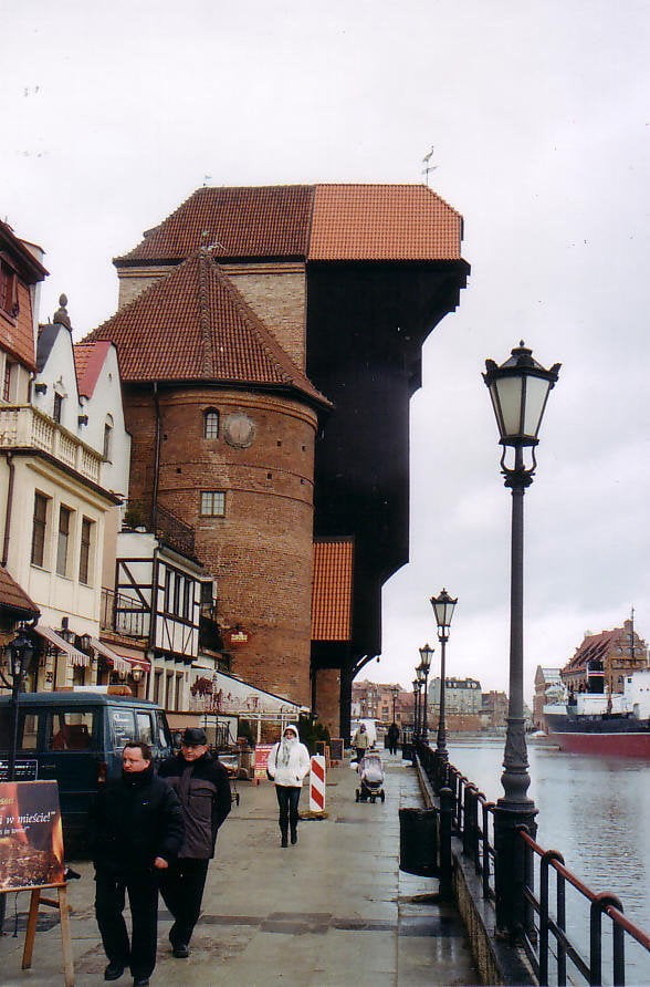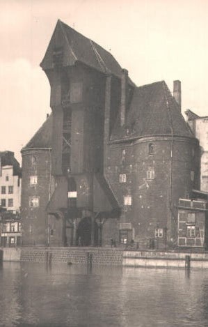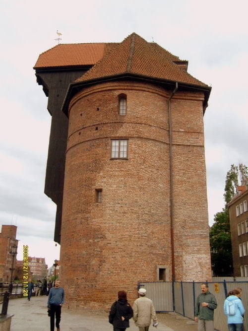 Żuraw, najstarszy zachowany dźwig portowy w Europie, został zbudowany w latach 1442-44. Obiekt pełnił potrójną funkcję: dźwigu portowego, bramy miejskiej i fortyfikacji obronnej. Budowlę wzniesiono nad brzegiem Motławy w formie dwóch ceglanych, cylindrycznych baszt, między którymi zainstalowano mechanizm dźwigowy zbudowany z drewna
