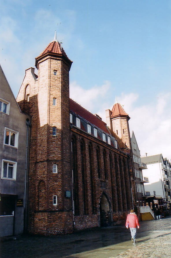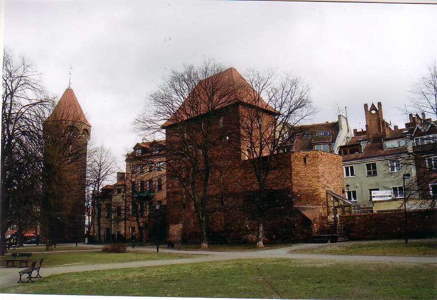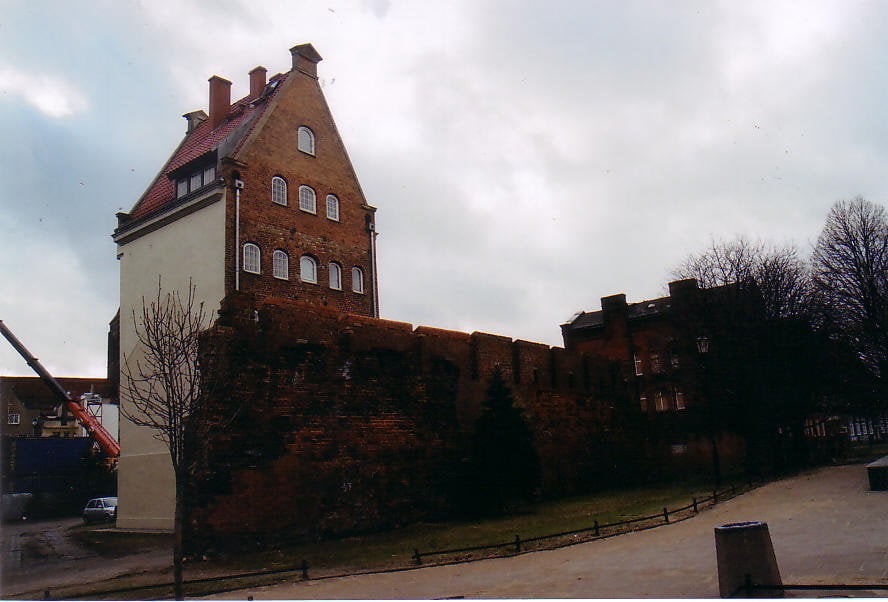 W 1263 miasto otrzymało prawa miejskie wzorowane na prawie lubeckim. Organizm miejski położony pomiędzy Motławą, Podwalem Staromiejskim, Targiem Węglowym a Podwalem Przedmiejskim otoczono około połowy XIV od strony lądu fosą i murem obronnym z licznymi basztami na ogół prostokątnymi otwartymi od strony miasta bez dachów. Około 1380 wybudowano od strony południowej i zachodniej niższy mur obronny. Przed murami przeprowadzono fosy, a od strony zachodniej w podwójnym ciągu. Do Głównego Miasta od strony lądu prowadziło 7 bram: