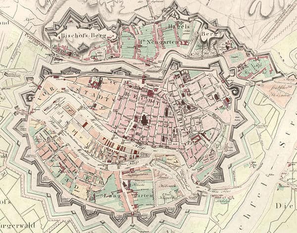 panorama miasta pod koniec XVII wieku na rysunku W.Meriana