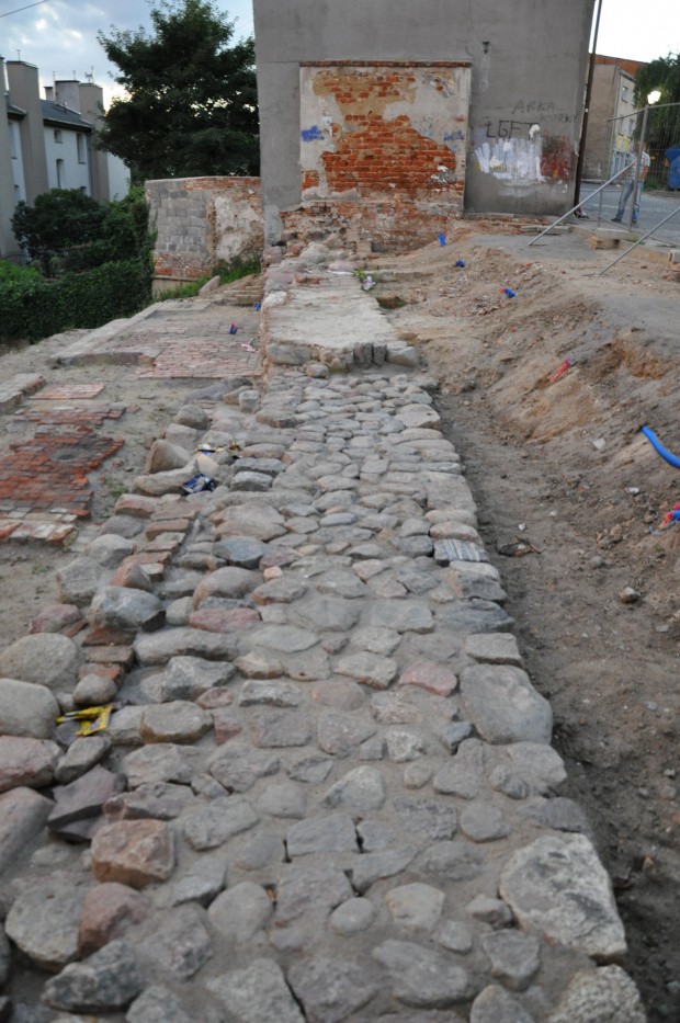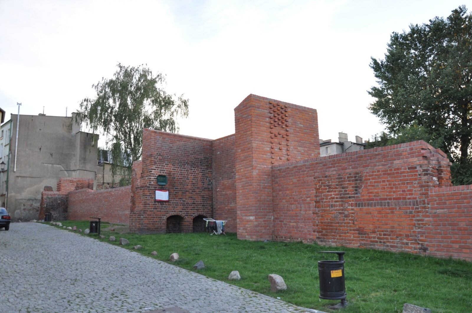 Po lewej - baszta narożna przy ul. Krótkiej. Z boku widoczne odkryte strzępia muru obronnego.