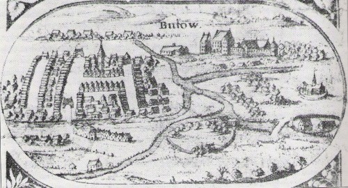panorama Bytowa na rysunku E.Lubinusa w 1618 roku, widoczny zamek (z prawej strony)
