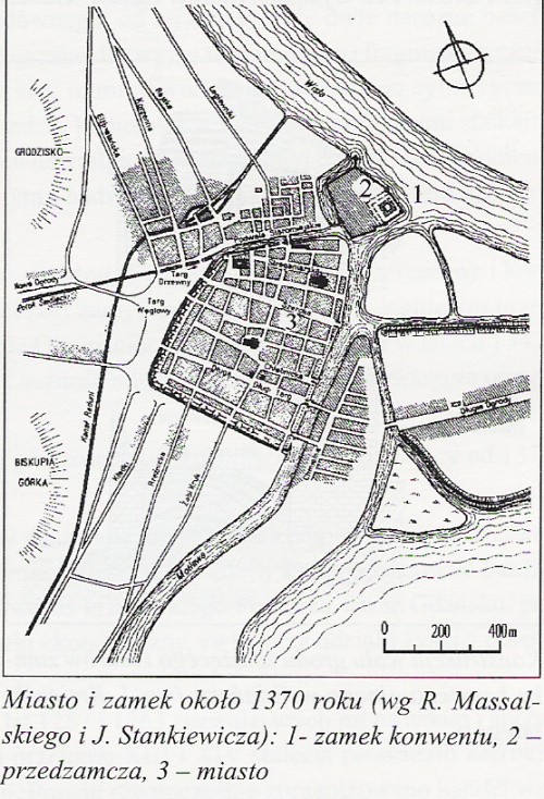 rekonstrukcja gdańskiego zamku autorstwa A. i R.Sypek, A-fosa zewnętrzna, B-zamek wysoki, 1-kościół zamkowy, 2-narożne wieżyczki, 3-mur zewnętrzny zamku wysokiego, 4-fosa (byc może sucha), C-Przedzamcze, 5-kościół, D-mury obwodowe, 6-gdanisko, 7-baszta rybacka, E-port krzyżacki
