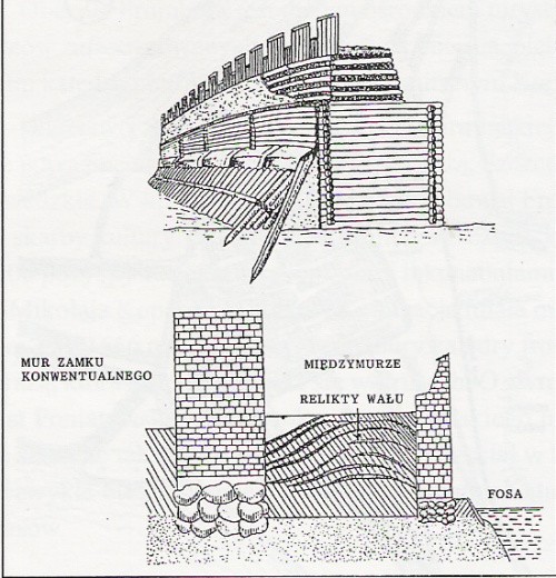 konstrukcja wału grodu książęcego i murów zamku wg J.Kmiecińskiego