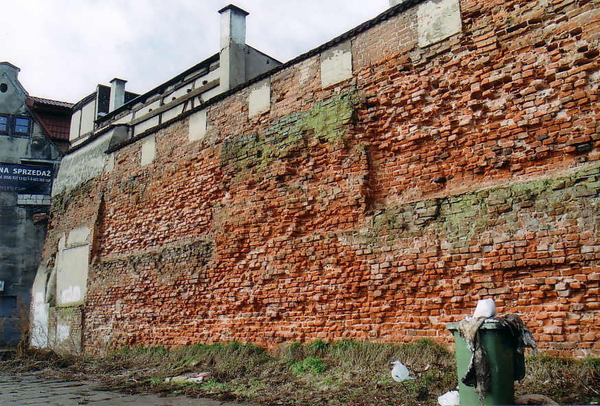 fragment muru zamkowego w wykopie niedaleko budynku z tablicą