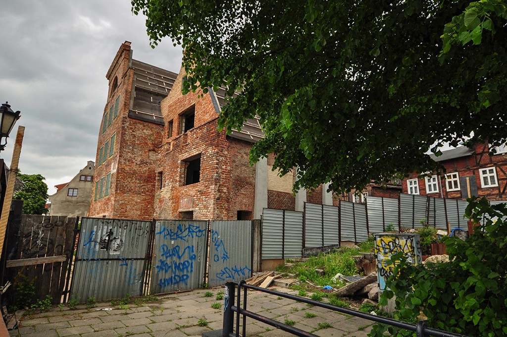 tablica informacyjna na jednym z budynków z informacją o istnieniu w tym miejscu grodu i zamku oraz ogólny widok na ten teren, obecnie zabudowany