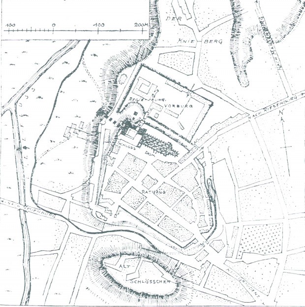 Wynika z tego, ze grodzisko położone było w zupełnie innym miejscu, na południe od miasta lokacyjnego. Nie mogę na podstawie tylko tej mapy uznać ten obiekt za osobny, aż do czasu wyjaśnienia moich wątpliwości. Może ktoś posiada więcej informacji na ten temat i mógłby je całkowicie rozwiać. Szczególnie interesuje mnie to jak dziś obecnie prezentuje się Alt Schlossen.