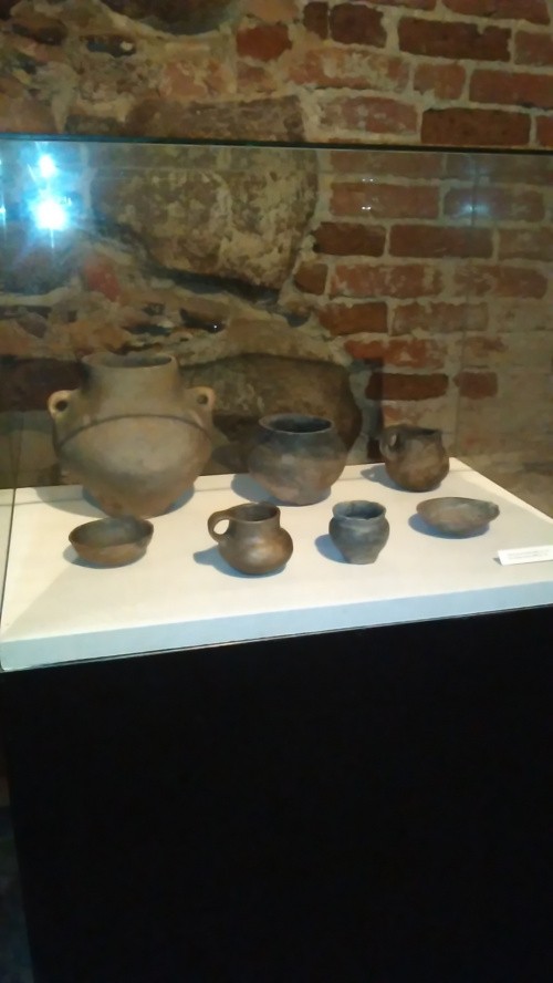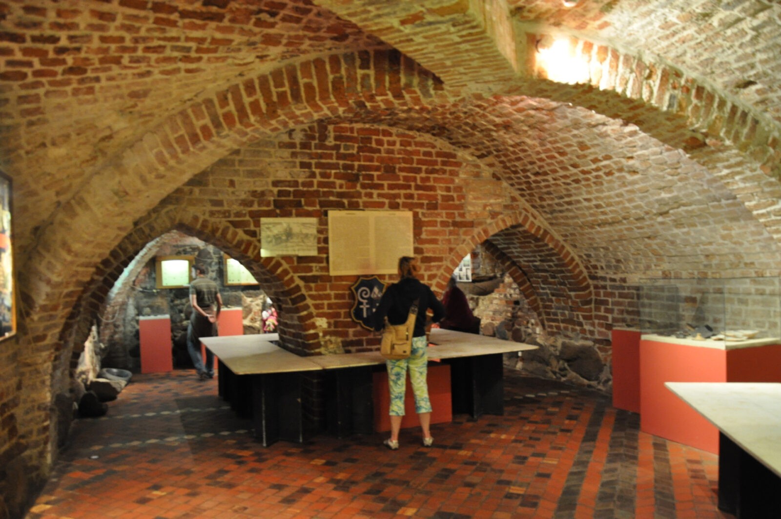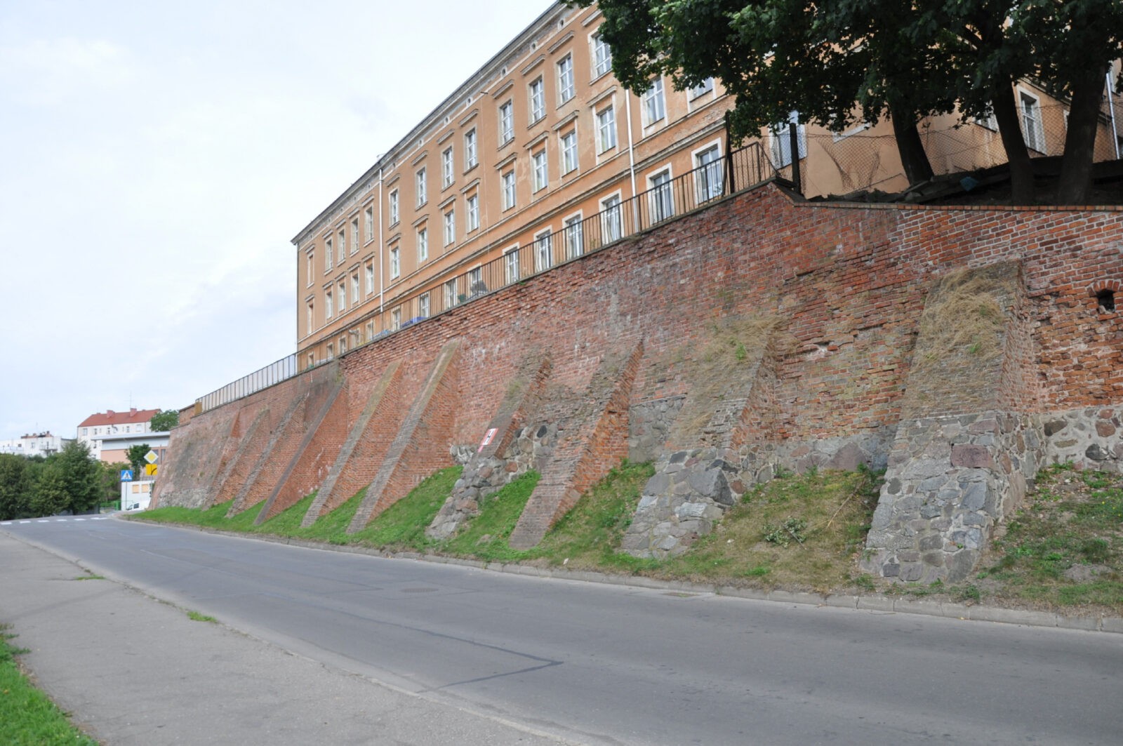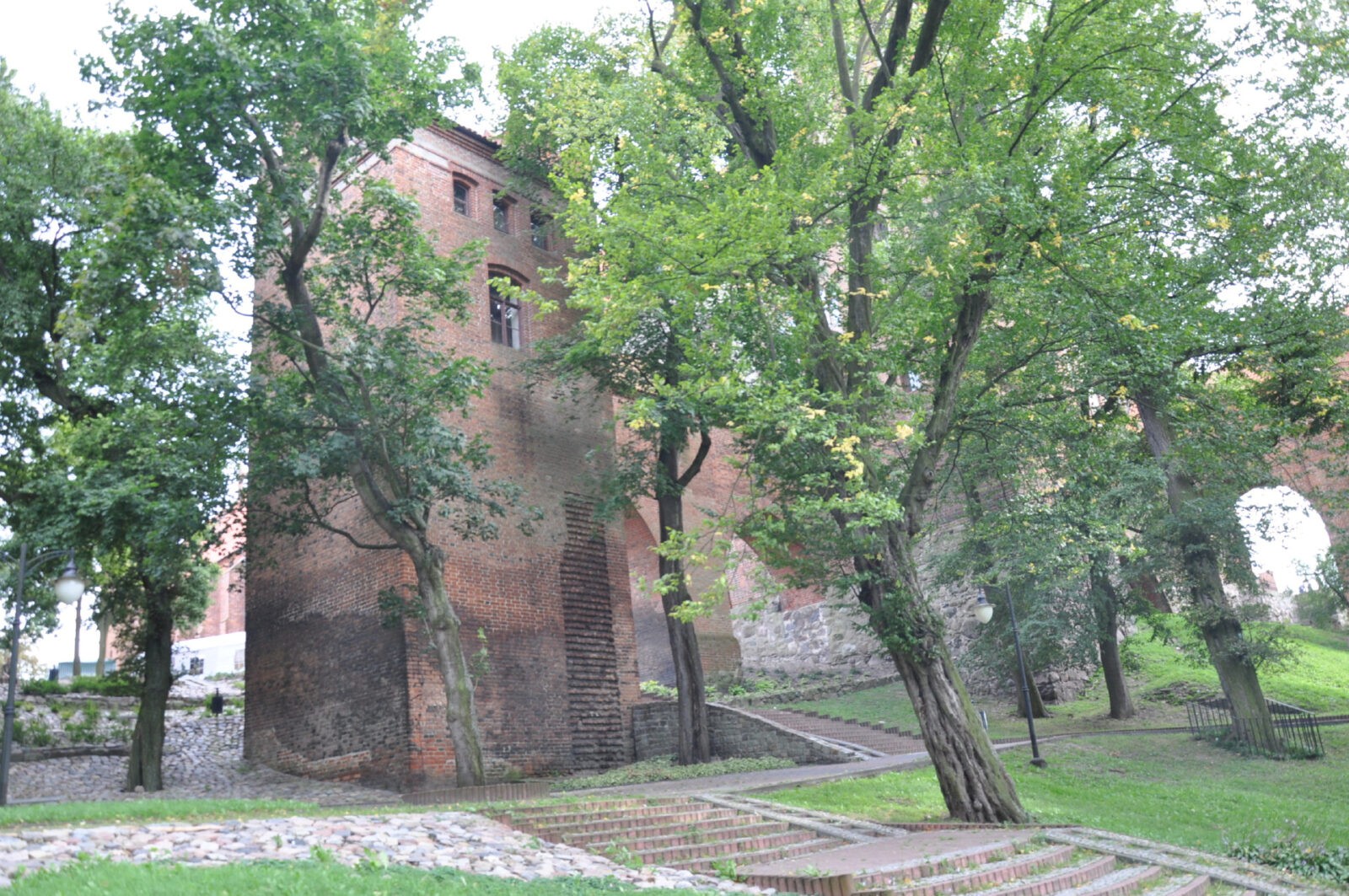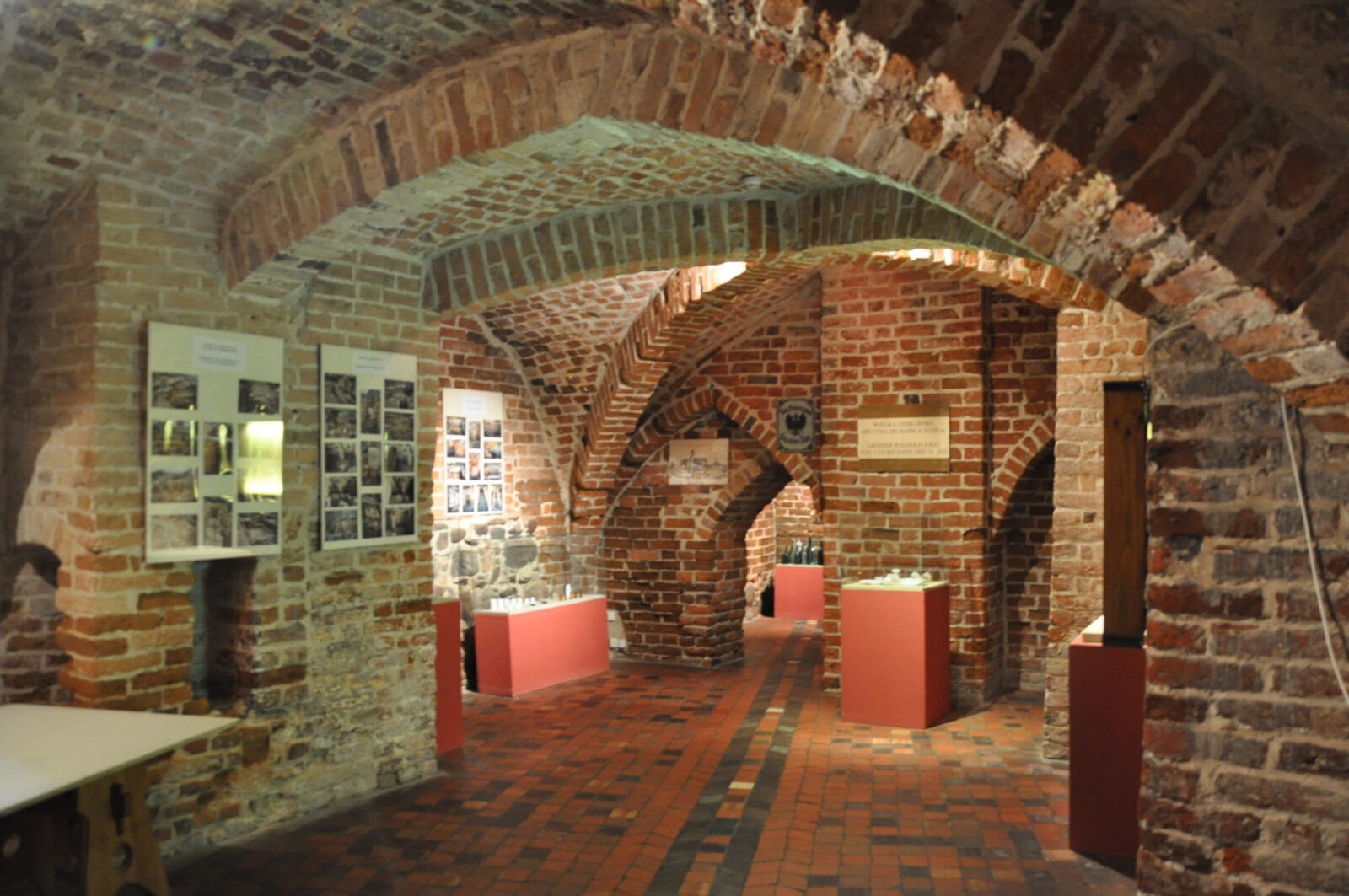 W toku prac wykopaliskowych w latach 1997 – 1998 odsłonięto pełny zarys dużego budynku murowanego założonego na planie prostokąta o wy-miarach około 23 x 15,8 m8. Ścianę północno-zachodnią stanowił miejski mur obronny, w którym zachowały się od strony miasta relikty otworów strzelniczych, przemurowane w okresie późniejszym na duże otwory okienne. W rzucie poziomym powierzchnia budynku była podzielona na trzy segmenty o szerokości około 6,7 m każdy i długości od 13,4 do 15,8 m, usytuowane szczytami w kierunku miasta i doliny Wisły. Fundamenty ścian północno – wschodniej i południowo-zachodniej wykonane, podobnie jak w murze obronnym, z dużych kamieni polnych układanych warstwowo na zaprawie wapiennej miały z nim wiązanie murarskie, wskazując tym samym na ich wspólne wznoszenie. Również ich głębokość posadowienia znajdowała się na tym samym poziomie, około 7 m poniżej jezdni dawnej Kaffeestrasse. Grubość ścian w piwnicach poniżej pach sklepienia wynosiła około 0,9 m, natomiast na parterze około 0,7 m[i]. Wymiary cegieł ”palcówek” są analogiczne jak w murze obronnym miasta i wynoszą 29,5 – 30 x 13,5 – 14 x 8 – 8,5 cm. Segment północny budynku dzieli się na trzy części o wymiarach 6,7 x 5,2 – 6,1 m. Ściany działowe mają około 0,6 m grubości i są wykonane z cegieł i kamieni na zaprawie wapiennej czyli analogicznie jak ściany konstrukcyjne – nośne. Podziały wewnętrzne pozostałych dwóch segmentów nie zostały do tej pory w pełni rozpoznane. Budynek ten funkcjonował zapewne do 1798 r. i został rozebrany wraz z południowym i wschodnim skrzydłem zamku. Jednak już na początku XIX w. na jego fundamentach został wzniesiony inny budynek trójsegmentowy, w którym nie wykorzystywano zasypanych w trakcie rozbiórki piwnic. Jego otoczenie stanowił bruk kamienny z „kocich łbów”, znajdujący się około 0,8 m poniżej obecnego poziomu terenu.