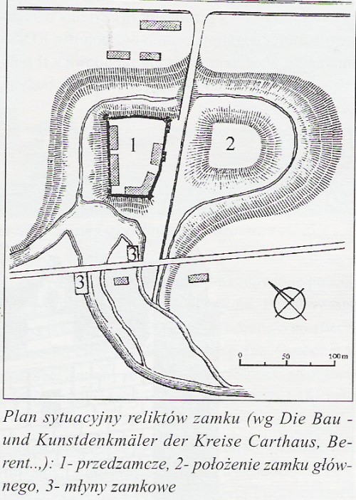 Pozostałości zamku znajdują się na szczycie wzniesienia opadającego do pradoliny rzeki Wierzyca. W miejscu tym pierwotnie znajdował się przynajmniej od 1281 roku gród książąt pomorskich. Krzyżacy przejęli go w 1316 roku i w końcu połowy XIV wieku zbudowali zamek. Było to założenie czworoboczne z narożnymi czworokątnymi wieżami wysuniętymi z lica kurtyn. Po 1466 roku przeszedł w ręce polskie i stał się siedzibą starostwa niegrodowego. Około 1600 roku został przekształcony w manierystyczną rezydencję której pozostałością jest zachowana do dziś wieża wschodnia z rozbudowanym budynkiem bramnym. W XIX wieku opuszczony zespół zamkowy przekształcono w założenie folwarczne z nowo wzniesionym budynkiem rządcówki.
