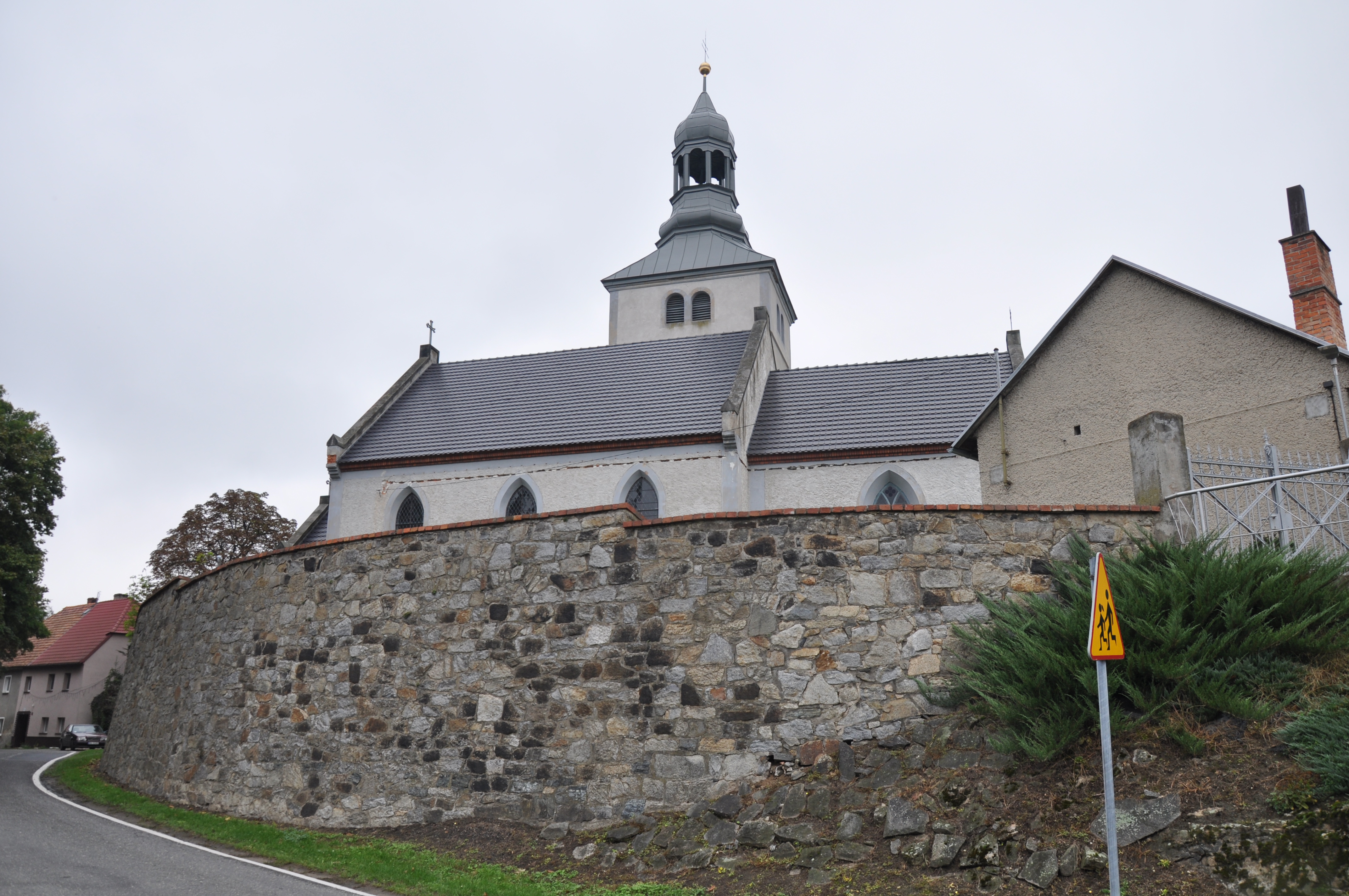 Świątynia gotycko-barokowa. Wzmiankowana w 1348 r. Obecny kościół z II poł. XV w., przebudowany po pożarze w 1664 r., restaurowany w 1894 i 1961 r. Orientowany, murowany, jednonawowy z wieżą od północy i kwadratowym prezbiterium nakrytym sklepieniem krzyżowym. Późnorenesansowe wyposażenie wnętrza m.in. ołtarz główny, ołtarze boczne, ambona i chrzcielnica, pochodzi z I poł. XVII w. łącznie z dzwonem na wieży z 1653 r.