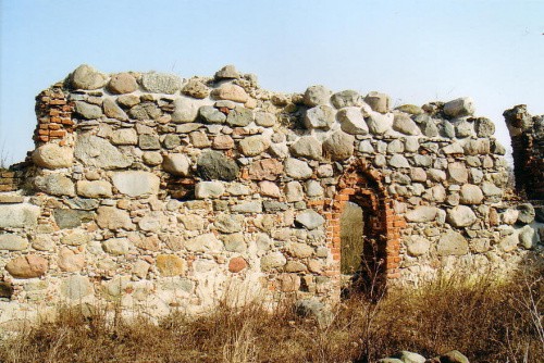Ruiny kościoła gotyckiego PW. Św. Jana Chrzciciela z XIII wieku. Jednonawowa świątynia z gotyckim portalem, zakrystią od północy, kruchtą od południa, dwoma szczytami od strony wschodniej i zachodniej. Do jej budowy użyto ociosanych polnych kamieni, spajanych zaprawą wapienną. Kościół był kryty dwuspadowym dachem, a zakrystia drewnianym daszkiem. Od strony zachodniej na dachu znajdowała się niewielka wieżyczka, na której wisiały trzy dzwony. Trzeba niezłej wyobraźni aby to wszystko zobaczyć, ale obok stoi tablica,, na której jest przedstawiony wygląd kościółka z lat świetności. Ostatnią mszę odprawiono w 1834 r. a w 1865 r. na polecenie rządu pruskiego rozpoczęto rozbiórkę mimo sprzeciwu biskupa