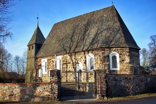 Kościół bez wieży powstał w II połowie XIII w. z kamienia i rudy darniowej. Dzwonnica dobudowana została w XV w., zawieszono w niej dzwon ufundowany w 1495 r. Niestety nie dotrwała ona do naszych czasów. Obecna dzwonnica pochodzi z 1752 r. Po zakończeniu wojny kościół był kościołem filialnym parafii Oczyszczenia Najświętszej Maryi Panny w Kożuchowie. Kościół założony jest na rzucie prostokąta z nawą tej samej szerokości co prezbiterium od wschodniej strony, które zamknięte jest trójkątnie. Prezbiterium jest najstarszą częścią kościoła. Od strony zachodniej stoi wolno stojąca drewniana dzwonnica. Od strony wschodniej na zewnątrz wmurowano epitafia. Dach kościoła pokrywa gont drewniany. Całość otacza mur kamienny. Mimo że kościół był wielokrotnie przebudowywany, zachował wczesnogotycki styl.