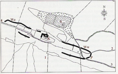 plan sytuacyjny Łysej Góry: Ww-wał wschodni, Wz-wał zachodni, K-klasztor Benedyktynów, B-polana Bielnik (Jałowa Łąka), P-pierwotna przerwa w wale, I-drogi i ścieżki leśne na terenie Świętokrzyskiego Parku Narodowego, 2-droga królewska, 3-droga zielona, 4-droga do św. Katarzyny