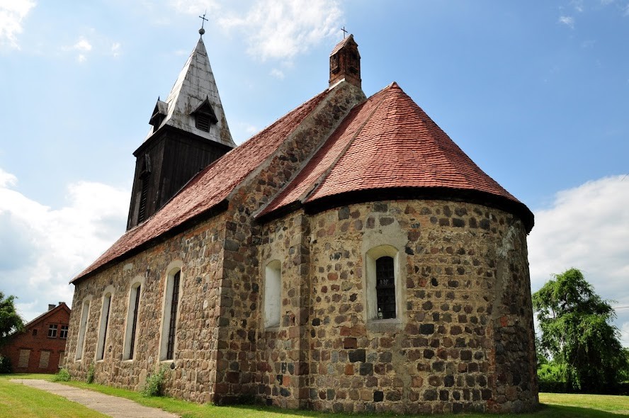 | Kościół usytuowany pośrodku wrzecionowatego nawsia powstał w drugiej połowie XIII wieku w okresie przejściowym romanizmu w gotyk. Jest to budowla salowa o wymiarach nawy 12,25 m x 8,60 m, wzniesiona na planie prostokąta z wyodrębnionym chórem zamkniętym apsydą i wieżą zachodnią tej samej szerokości co nawa. Całość budowli wzniesiona jest z dokładnie obrobionych kwadr granitowych o jednolitym formacie, ułożonych w regularne, poziome warstwy. Dokładniej opracowano narożniki ścian, ościeża portali i okien. Grubość ścian wynosi około 1,18 m.