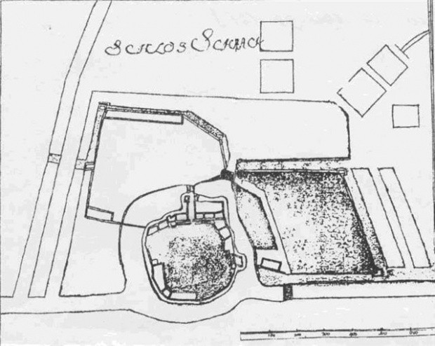 Zamek krzyżacki Schaaken został założony około 1270 roku. Zamek murowany powstał w pierwszej połowie XIV wieku na planie kolistym, z wieżą na zewnątrz. Dom mieszkalny znajdował się w części południowej, wewnątrz obwodu murów. Brama w części południowo-wschodniej. Przed bramą rozciągało się przedzamcze. Dom mieszkalny przebudowany został w połowie XIX wieku. Zamek użytkowany jest przez gospodarstwo rolne. Mur obwodowy zachowany w całości, w części poludniowo-wschodniej posiada wysokość do 5 m.