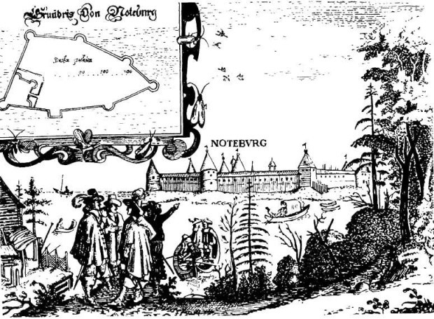 W maju 1612 r., podczas wojny między Szwecją a Rosją (1610-1617), twierdza została zdobyta przez Szwedów po dziewięciomiesięcznym oblężeniu i od tej pory gród nosił nazwę Nöteborg. W roku 1702, w czasie wojny północnej twierdza została zajęta przez Rosjan po wysadzeniu na wyspie desantu. Na rozkaz cara Piotra Wielkiego twierdzy nadano obecną nazwę. W języku niemieckim Schlüsselburg oznacza miasto-klucz (miał być to klucz do podboju Finlandii).