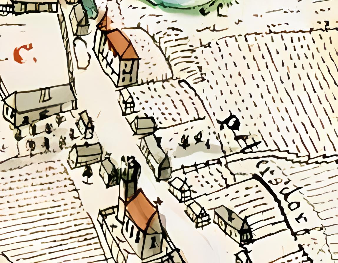 SZOBISZOWICE, fragment panoramy Gliwic F.B. Wernera z widokiem Szobiszowic (Petersdorf); u dołu stary kościół parafialny św. Bartłomieja, u góry zamek, naprzeciw niego folwark oznaczony czerwoną literą C