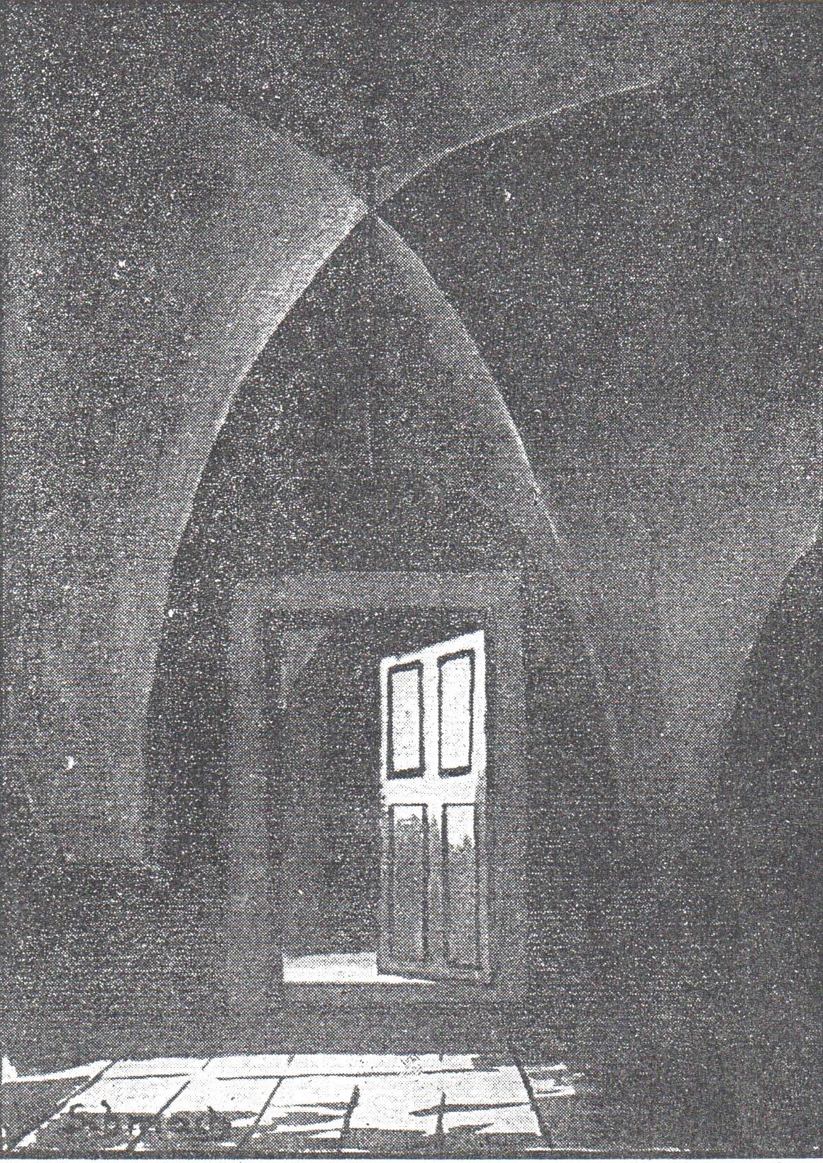 SZOBISZOWICE, rysunek sklepionego wnętrza zamku z lat 30-tych XX wieku; ostre krawędzie sklepień zdają się zaznaczać szwy charakterystyczne dla późnego renesansu wg OiB