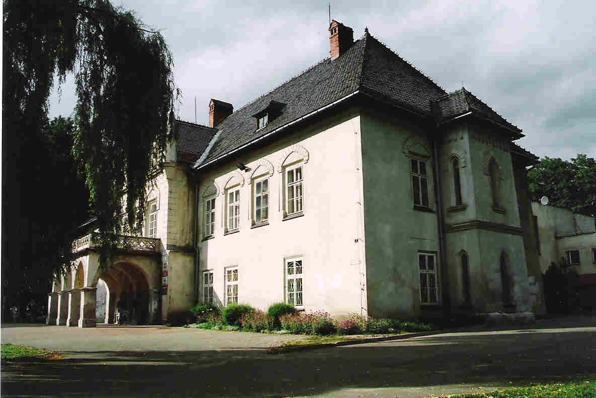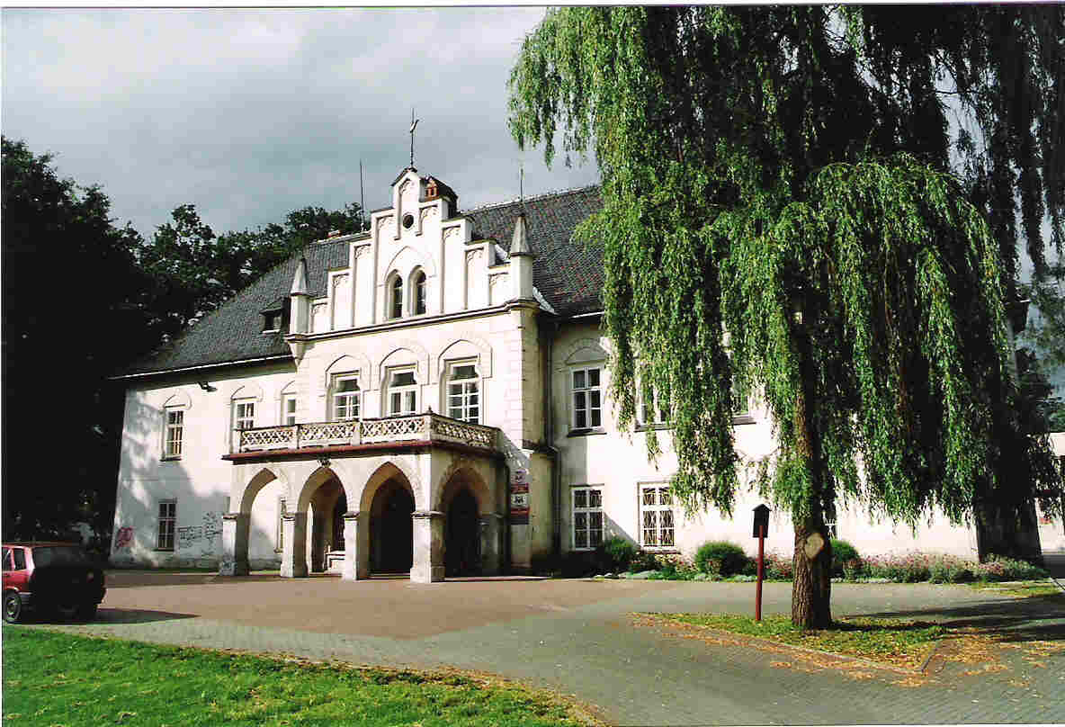 W 1618 roku Mikołaj Komorowski (ówczesny właściciel miasta) sprzedał Łodygowice wraz z wioskami (10 wsi) swemu dworzaninowi Krzysztofowi Rarowskiemu. Kolejnym dziedzicem Łodygowic był książe Jerzy Zbaraski, który zamienił się z Rarowskim dobrami na Wołyniu. Książe Jerzy Zbaraski, kasztelan krakowski, w 1629 roku rozpoczął w Łodygowicach budowę dworu murowanego, zwanego do dziś zamkiem, na miejscu wcześniejszych drewnianych umocnień. Budowa ona od 1629 aż do 1673 roku, a kończył ją już następny właściciel Klucza Łodygowickiego, Stanisław Warszycki (także kasztelan krakowski). Wzniósł on bastionowe fortyfikacje wokół dworu, przekształcając go w modny wówczas "pałac w fortecy" (Modelowym przykładem takiego założenia jest zamek Lubomirskich w Nowym Wiśniczu). Dwór został bardzo mocno przebudowany w XIX wieku, obecnie stanowi neogotycki pałacyk. Po obwałowaniach nie ma prawie śladu. Plan pałacu ma obecnie kształt krzyża. Dawny dwór obronny stanowi jego północne ramię. Budynek jest piętrowy i otynkowany. Uważnie patrząc dostrzec można masywne mury dworu i kilka kamiennych obramowań okiennych z XVII wieku.