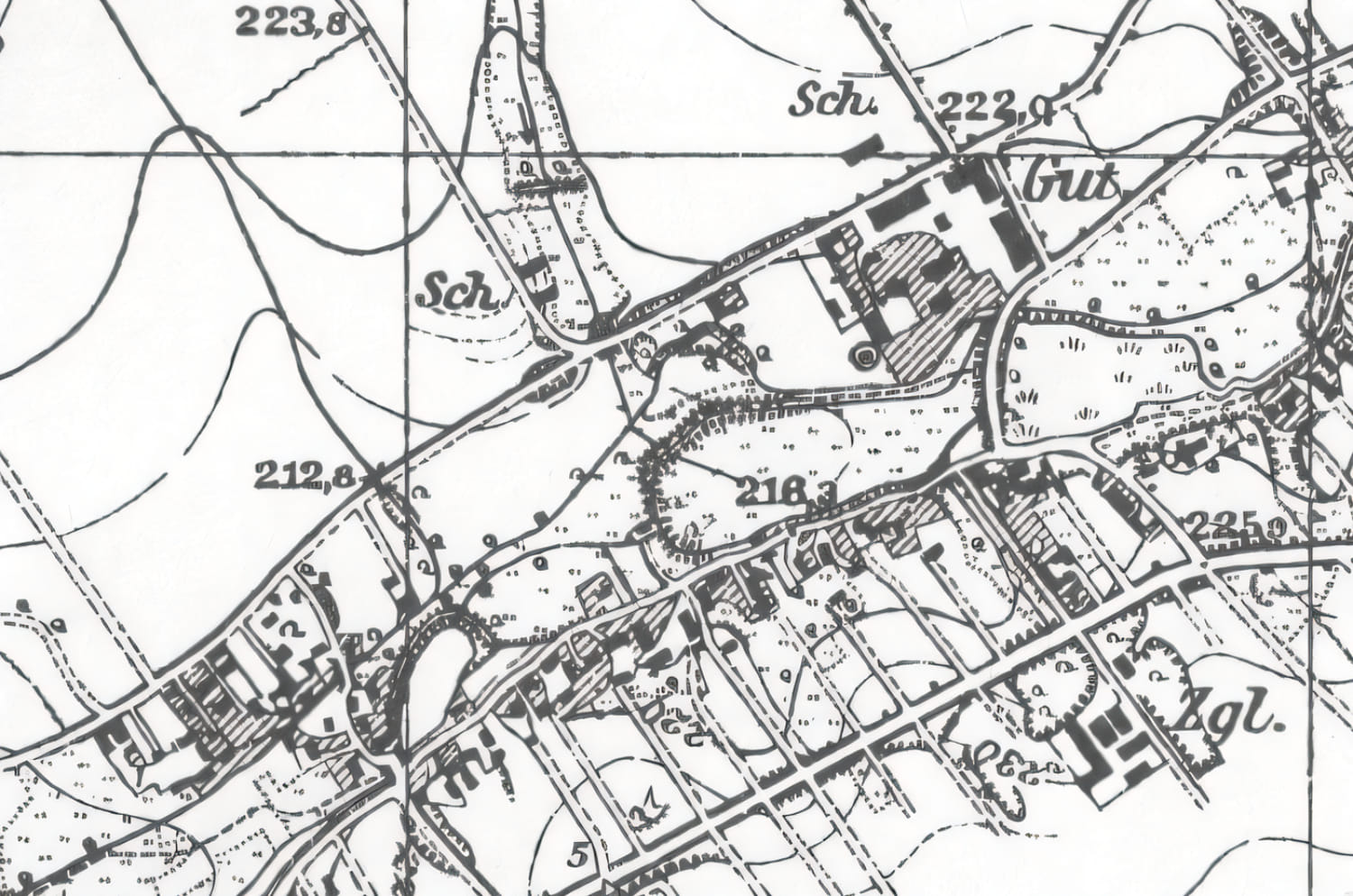 SIERAKOWICE, fragment mapy (arkusz Jakobswalde 5776) sporządzonej w 1883 r. zaktualizowana ok. 1940 r.; Gut – miejsce położenia dworu (zb. P. Siemko, Katalog Zamków i Dworów Obronnych Śląska [ https://zamki.pwr.edu.pl/ ]. Licencja: CC BY-SA 4.0 [ https://creativecommons.org/licenses/by-nc/4.0/ ])