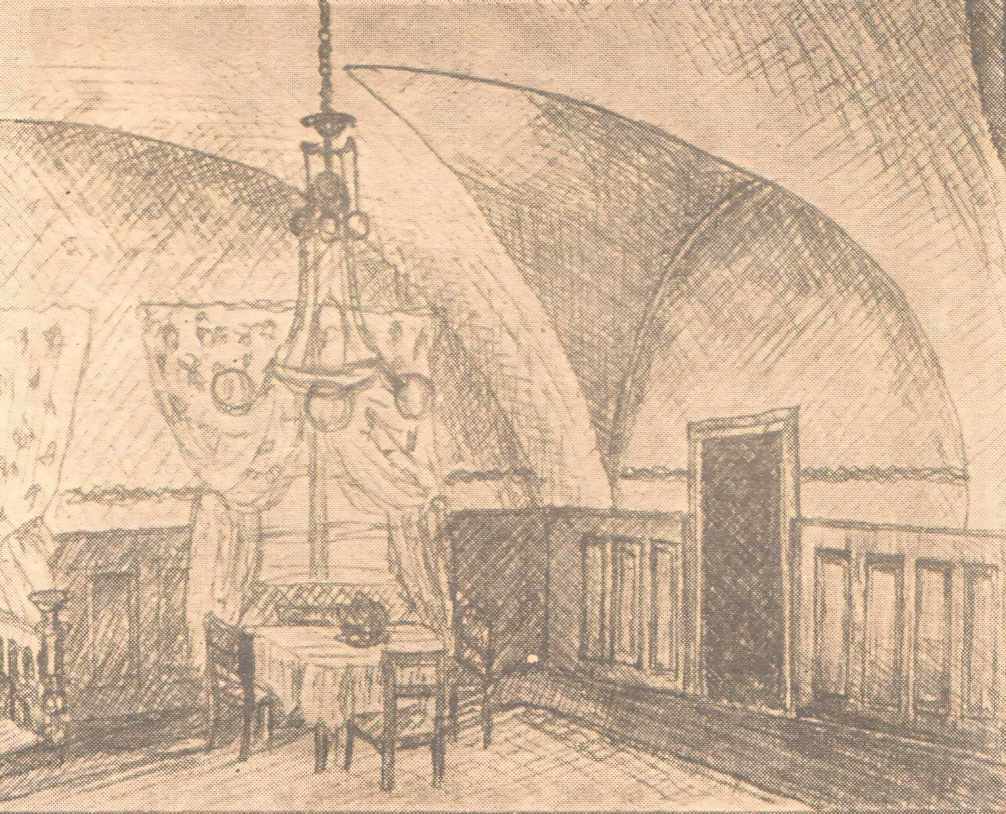 SIERAKOWICE, rysunek jednego z wnętrz na parterze dawnego zamku w latach 30-tych XX wieku ; widoczne sklepienie kolebkowe z lunetami (OiB 1934 nr 51)