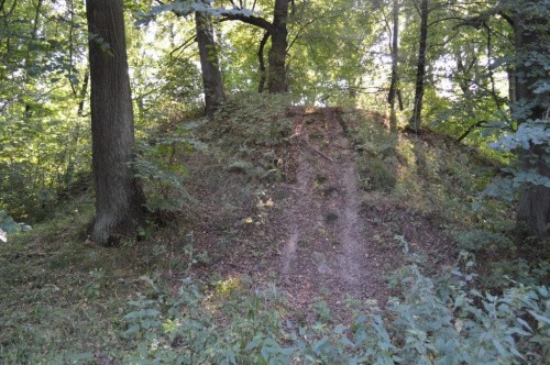 Samochód parkujemy przy cmentarzu, gródek znajduję się zaraz na przeciwko. Ładny kopiec otoczony fosą oraz częściowo wałem.