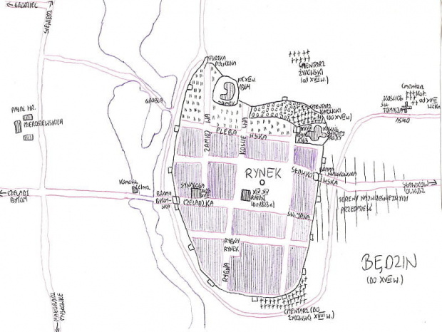 Mury miejskie w Będzinie kazał zbudować król Kazimierz Wielki. O fakcie tym wspominał Janko z Czarnkowa w "Kronice Polskiej 1333-1384", a później pisał o tym Jan Długosz. na miejscu wcześniejszych umocnień drewnianych. Mury wzniesiono w latach 60. XIV w. Były połączone z murami obwodowymi zbudowanego wcześniej zamku królewskiego. Zbudowano też dwie bramy Sławkowską (Krakowską) i Bytomską (Wrocławską). Mury zostały zniszczone częściowo w roku 1655. W 1823 roku istniała już tylko część południowo-wschodnia i wschodnia. W latach 1952-1956 dokonano niewielkiej rekonstrukcji części murów a w szczególności jedną z baszt. Powierzchnia miasta otoczona murami wynosiła około 7 ha, długość linii obwarowań wynosiła około 1000 metrów. Średnica miasta wewnątrz murów wynosiła 350 na 250 metrów. Mury wzniesiono z kamienia łamanego na zaprawie wapiennej. Grubość muru wynosiła 1,80-1,90 metra. Obecna wysokość to około 8,5 metra. Krenlaż zachowała się w postaci szczątkowej (obecnie częściowo zrekonstruowany), jego grubość wynosi 60 cm, blanki około 2,40 a prześwity 65-70 cm. Baszty były zbudowane na planie prostokąta, były wysokości murów i były otwarte od strony miasta. Odległość między nimi wynosiła około 60 metrów. Jedna z zachowanych ma wymiary 7,35(czoło) x 5,30 x 5,50. Druga zachowana baszta ma wymiary 7,95(czoło) x 5,00 x 5,15. Na dawnych planach zachował się ślad uliczki podmurnej. Chodnik dla obrońców wynosił do 1,3 metra. Nie wiadomo ile mury w Będzinie miały baszt (badań archeologicznych nie prowadzono). Bramy się nie zachowały (w 1823 r. istniała jeszcze brama Sławkowska). Do dziś zachował się niewielki odcinek, z dwiema częściowo zrekonstruowanymi basztami na planie prostokąta. Mury wyznaczały owalny kształt miasta, którego urbanistyczny układ średniowieczny jest czytelny do dzisiaj. plan XVIII wiecznego Bedzina z zaznaczeniem murów miejskich (źr:Wikipedia)