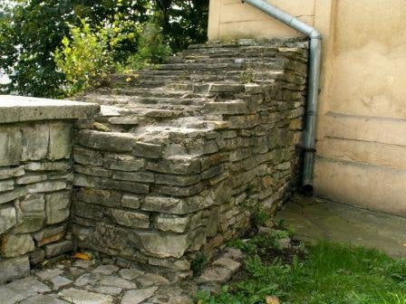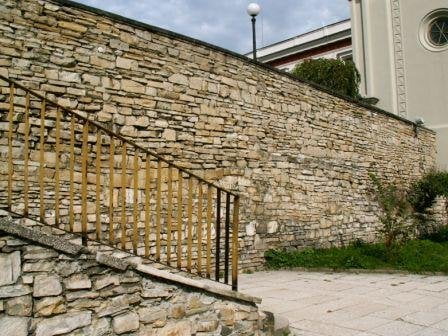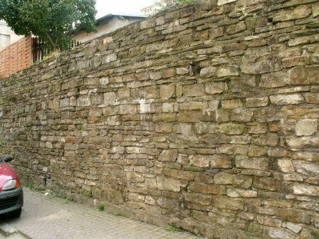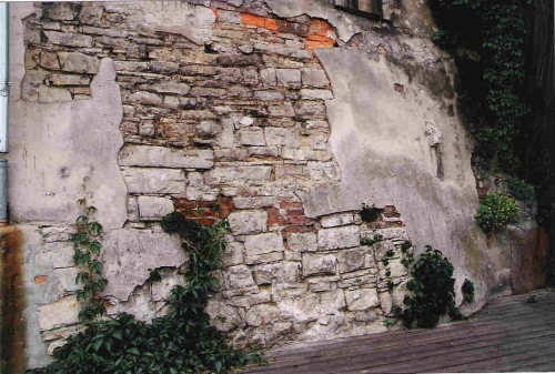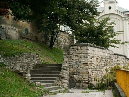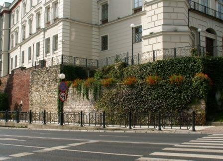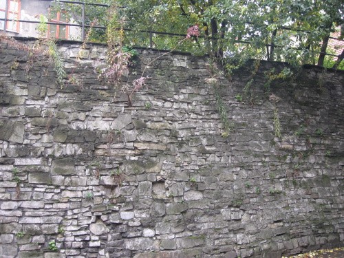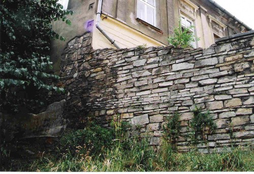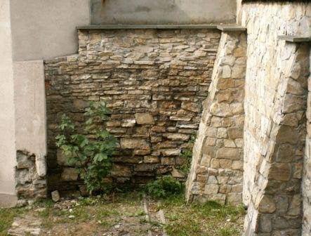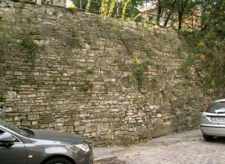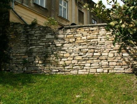 Solidny mur o ponadmetrowej szerokości, wykonany z dużych bloków wapienia cieszyńskiego i rzecznych otoczaków na wapiennej zaprawie, ciągnie się wzdłuż ulicy i zamku.