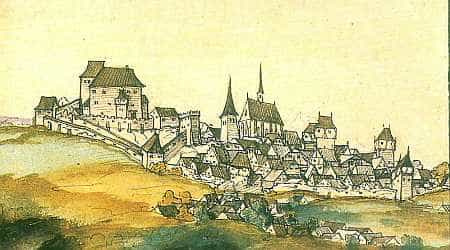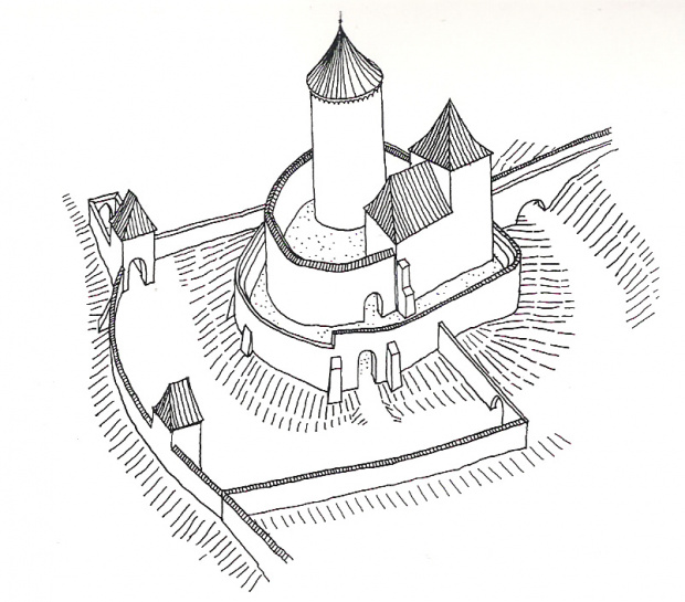 Widok z wieży zaiste był imponujący... Na ilustracji widać także wyjście z kasztelu – przez drewniany ganek – na wewnętrzny mur obwodowy, którym można było się dostać do wieży okrągłej.