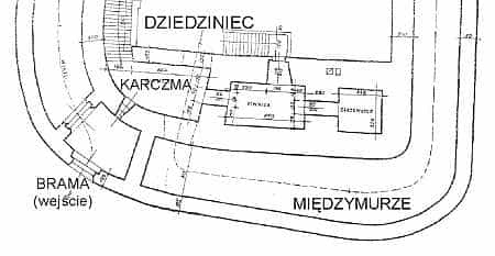 Na ilustracji powyżej widzimy południową część zamku górnego: brama (dawna wieża bramna), obecna karczma, przylegające do niej dwa pomieszczenia najniższej kondygnacji kasztelu-budynku mieszkalnego. UWAGA: rysunek nie obrazuje różnicy wysokości – poziom podłogi karczmy, I kondygnacji kasztelu oraz wschodniej (prawej) części międzymurza jest o kilka metrów (2-3) wyższy niż poziom bramy i przylegającej do niej zachodniej części międzymurza. Rysunek przedstawia stan obecny; w średniowieczu nie było połączenia pomiędzy pomieszczeniami kasztelu, a w miejscu, gdzie widnieje połączenie karczmy z kasztelem, w murze mogła istnieć tylko strzelnica (jak na wyższych kondygnacjach). Oczywiście nie była ona skierowana do karczmy, a na dziedziniec, jako że mur oddzielający karczmę od dziedzińca początkowo nie istniał. Stało sie to dopiero po zniszczeniu bramy wjazdowej. Zamurowano wówczas wejście z międzymurza (II kondygnacja bramy wjazdowej) na dziedziniec (na powyższym rysunku zaznaczone przerywaną kreską) oraz dobudowano stosunkowo wąski mur od strony północnej. Tak powstałe pomieszczenie następnie przykryto kamiennym sklepieniem, a budynek mieszkalny wydłużył się do trzech pomieszczeń przynajmniej na jednej kondygnacji.