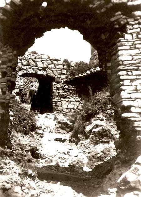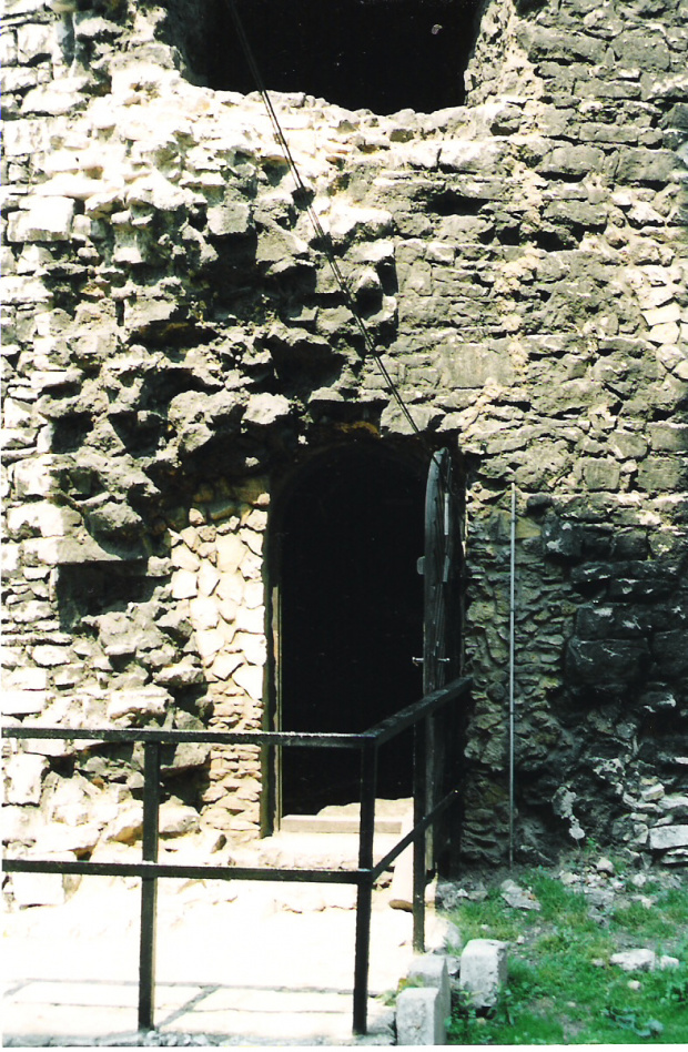 Ruiny bramy wjazdowej (wieży bramnej?), lata 50. ubiegłego wieku. Na pierwszym planie otwór w I murze obwodowym, następnie resztki II muru oraz dobudowany mur z wejściem od strony dziedzińca. Po prawej stronie widoczny zarys kamiennego sklepienia (obecnie karczma na zamku).