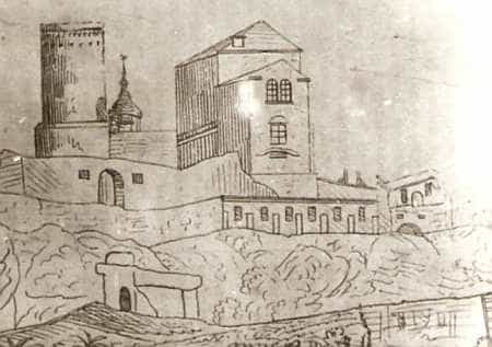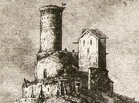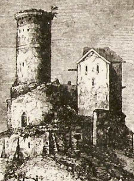 Wieża okrągła na rycinie z około 1800 r. Widać wyraźnie jej podział na 3 (a nie jak dzisiaj – na dwie) części, przy czym samo zwieńczenie znowu się poszerza i można się doszukać nawet resztek krenelażu. Całą wieża jest zdecydowanie wyższa od budynku mieszkalnego, który w tym przypadku ma dość osobliwą formę – ni to kasztel, ni to budynek mieszkalny z wieżą kwadratową a przypomina nawet nieco akwarelę Gerunga, gdzie kasztel od południa (czyli na ilustracji powyżej – po prawej stronie) ma jakąś przybudówkę.