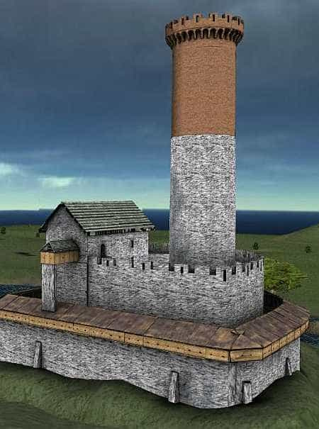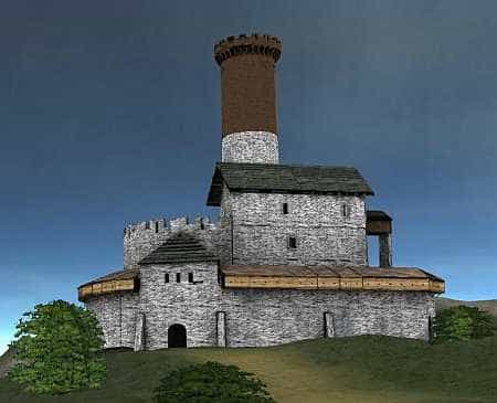Hipotetyczny widok kasztelu w wersji 4-kondygnacyjnej. Rozkład strzelnic na ilustracji nie odpowiada rzeczywistości.