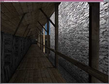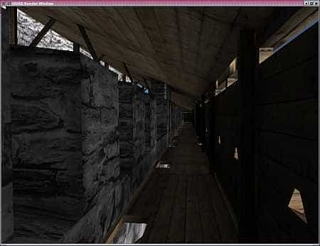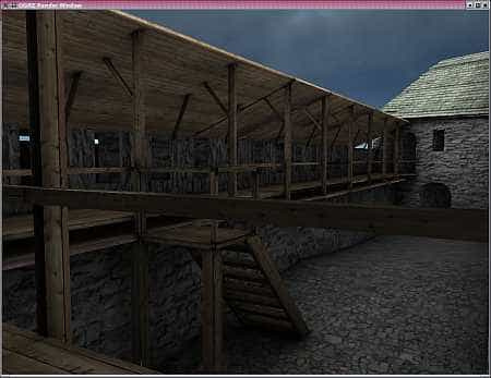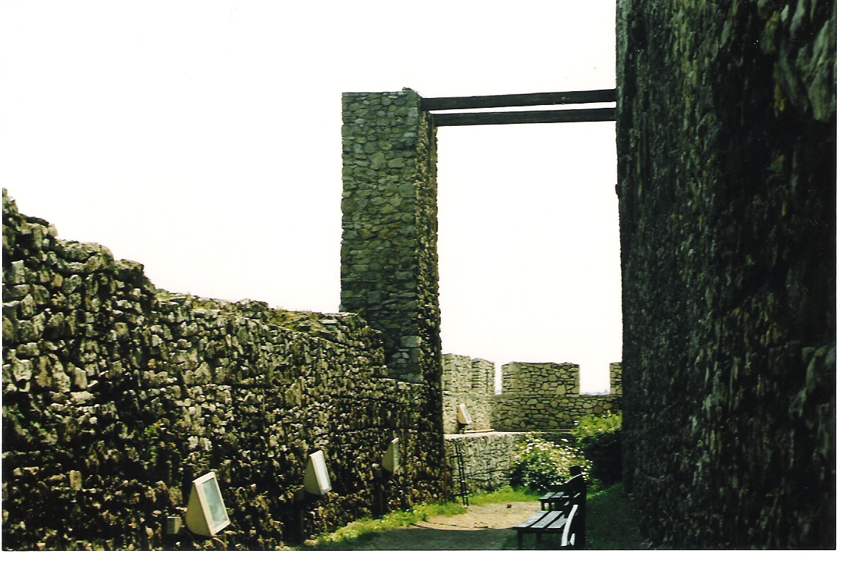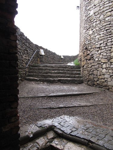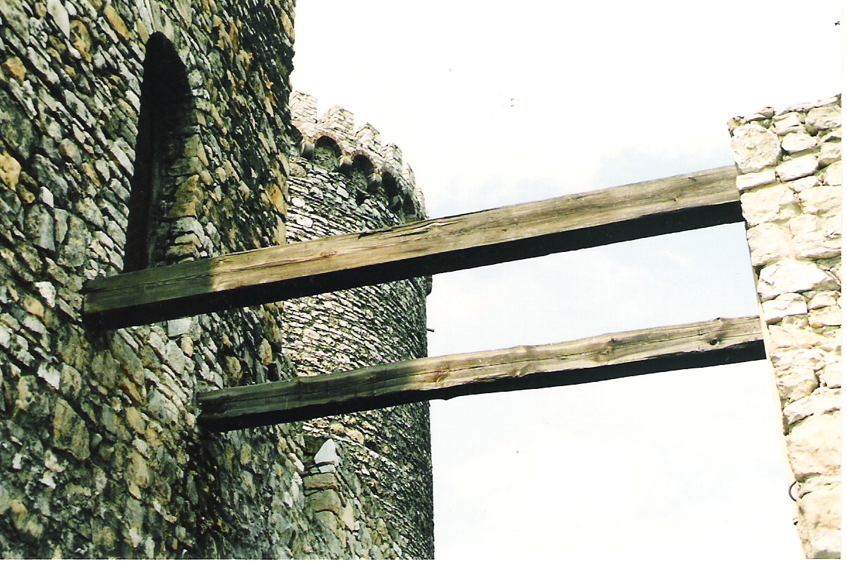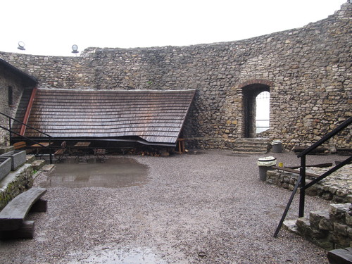 Ganek dla obrońców – drewniana podłoga na – istniejącym do dziś – kamiennym chodniku na zewnętrznym murze obwodowym zamku górnego. Po prawej stronie wąskie międzymurze oraz ściana wschodnia budynku mieszkalnego.