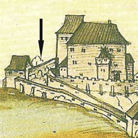 Na weducie M. Gerunga w miejscu, gdzie powinna być brama wjazdowa na zamek górny jest puste miejsce. Widać także niewielki budyneczek, na lewo od kasztelu, jakby doń przylepiony, jednak ze względu na okoliczności przytoczone poniżej, nie może ona stanowić wieży bramnej, także przecież niemal stykającej się (narożnikiem) z budynkiem mieszkalnym.