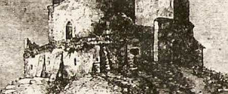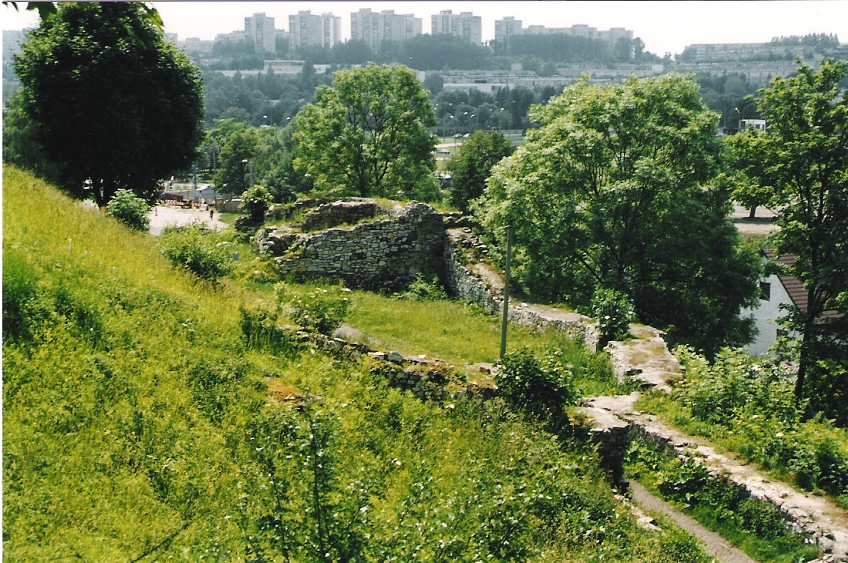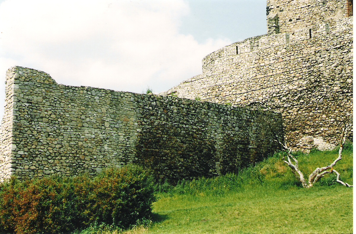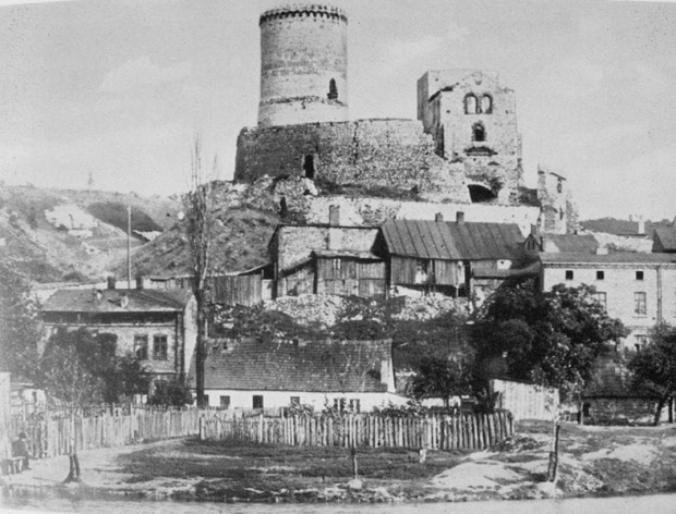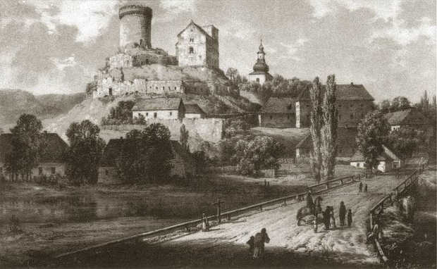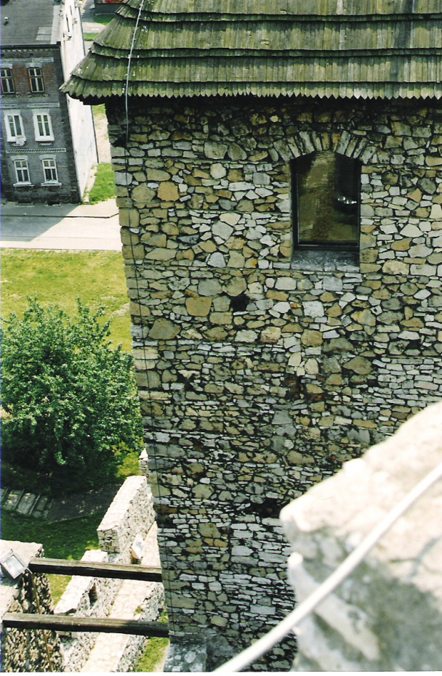 Poniższa ilustracja, pochodząca z połowy XIX wieku, trochę nam sprawę komplikuje. Z jednej strony przedstawiony mur wygląda niemal identycznie jak u mur zamku dolnego u Gerunga (daszek, strzelnice), ale jest to zewnętrzny mur zamku górnego. Mur wewnętrzny, oczywiście wyższy, nie posiada krenelażu, ani ta część zachodnia (nad wejściem na dziedziniec), najwidoczniej zniszczona, ani wschodnia (z wieżą kościoła w tle). Tajemniczy i dość nieudolnie narysowany obiekt na pierwszym planie to albo wieża wjazdowa albo baszta kwadratowa – elementy zamku dolnego.