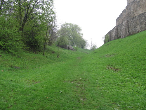 Zamek z uliczki do niego prowadzącej oraz fosa, znajdująca się po lewej stronie.