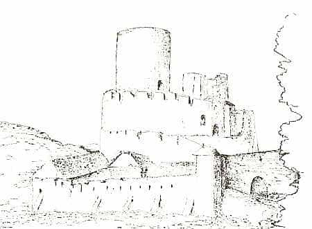 Jeden z najstarszych wizerunków zamku – 1800 r. Widoczny mur wewnętrzny (z wejściem na dziedziniec) oraz zewnętrzny, w którym widzimy dość regularnie rozmieszczone pomiędzy przyporami otwory strzelnicze, usytuowane stosunkowo nisko. W zwieńczeniu muru można się doszukać daszku.