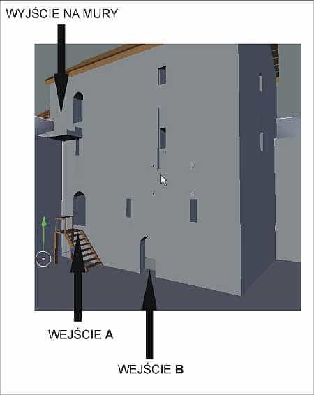 Oprócz różnic wysokości istnieje jeszcze jeden problem związany z poszczególnymi kondygnacjami bramy wjazdowej. Otóż wejście dolne do wieży jest bardziej z lewej strony, natomiast wejście górne (z międzymurza na dziedziniec) bardziej z prawej, bezpośrednio przy zachodnim murze budynku mieszkalnego. Tak to wygląda na rysunku z projektu Z. Gawlika (rzut budynku wieży bramnej na poziomie II kondygnacji):